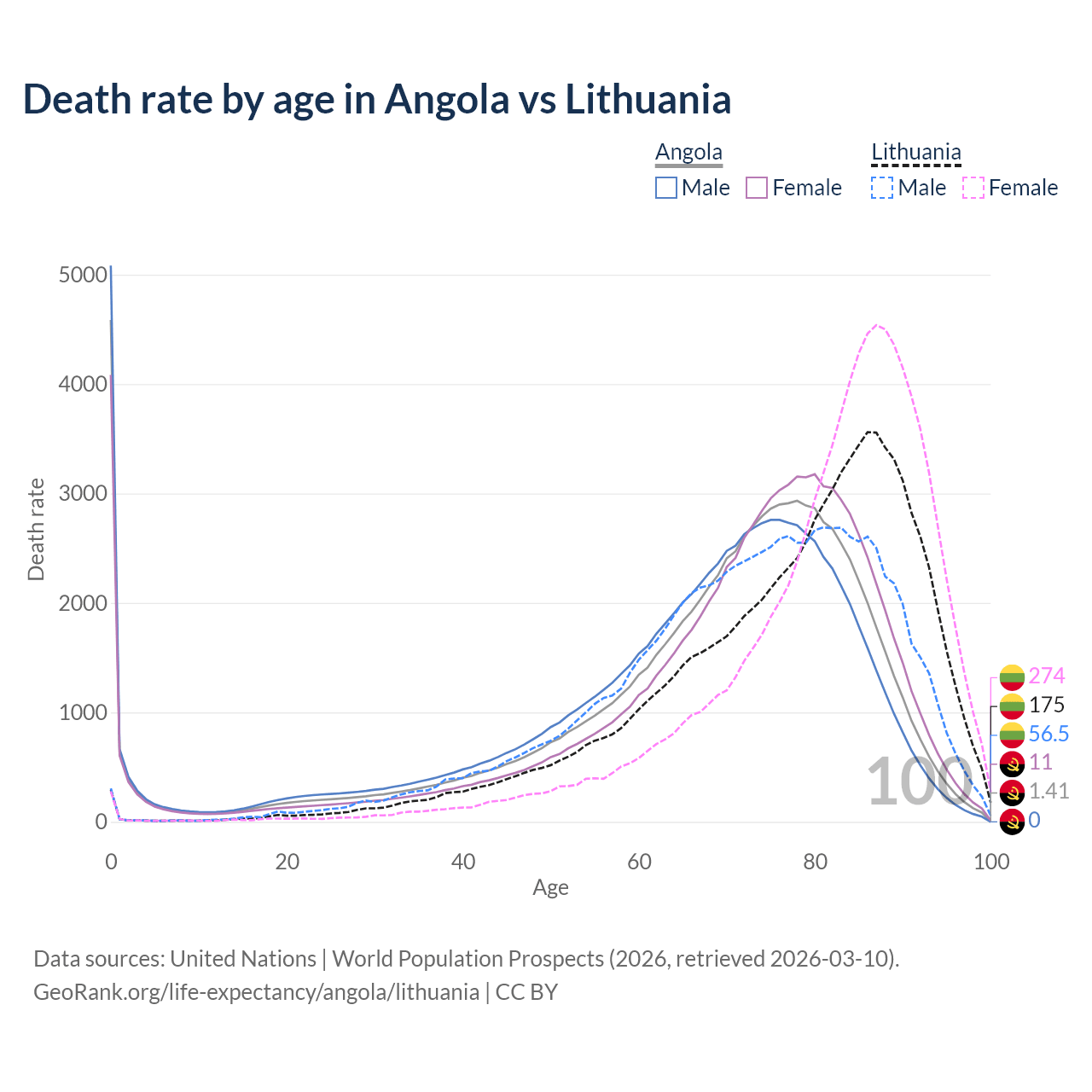 This life expectancy calculator shows the odds of living to 100, 95, 90, and below based on current age for both males and females in Angola and Lithuania, along with mean and median age of death. The calculations are based on the 2026 life tables (actuarial tables) from the UN World Population Prospects.