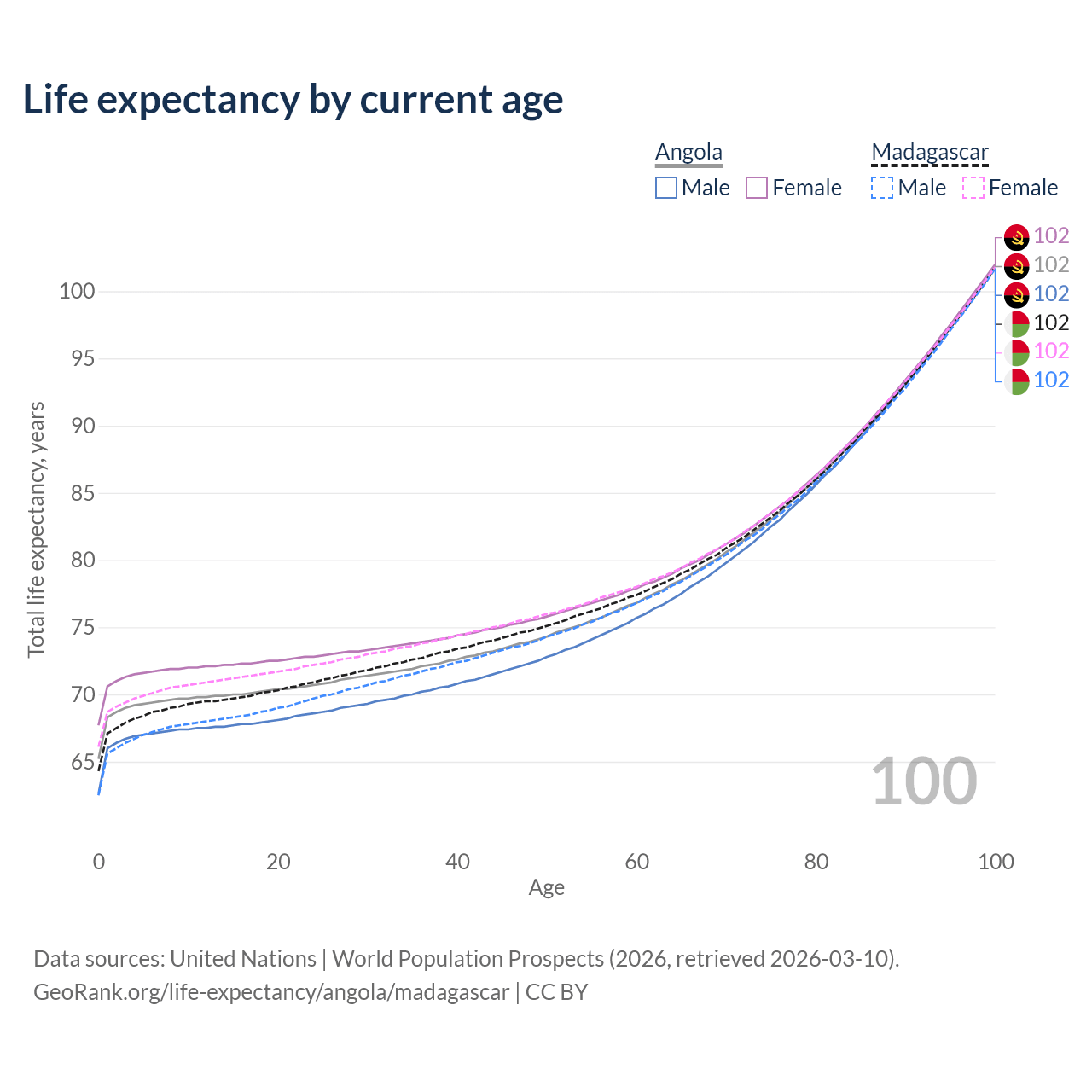 This life expectancy calculator shows the odds of living to 100, 95, 90, and below based on current age for both males and females in Angola and Madagascar, along with mean and median age of death. The calculations are based on the 2026 life tables (actuarial tables) from the UN World Population Prospects.