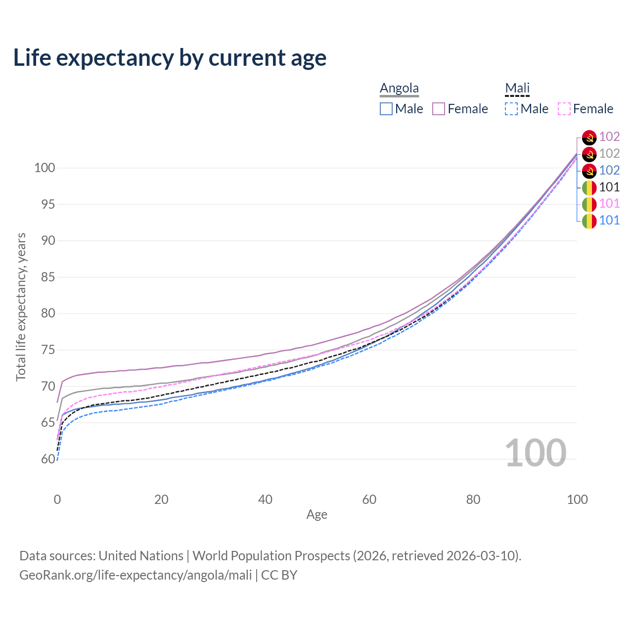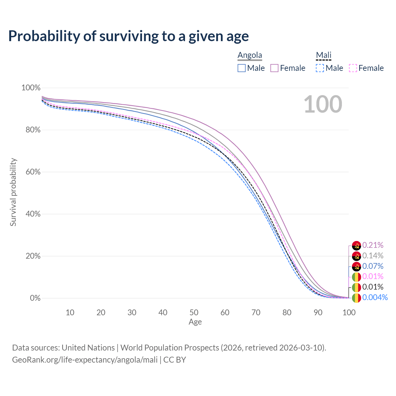 This life expectancy calculator shows the odds of living to 100, 95, 90, and below based on current age for both males and females in Angola and Mali, along with mean and median age of death. The calculations are based on the 2026 life tables (actuarial tables) from the UN World Population Prospects.