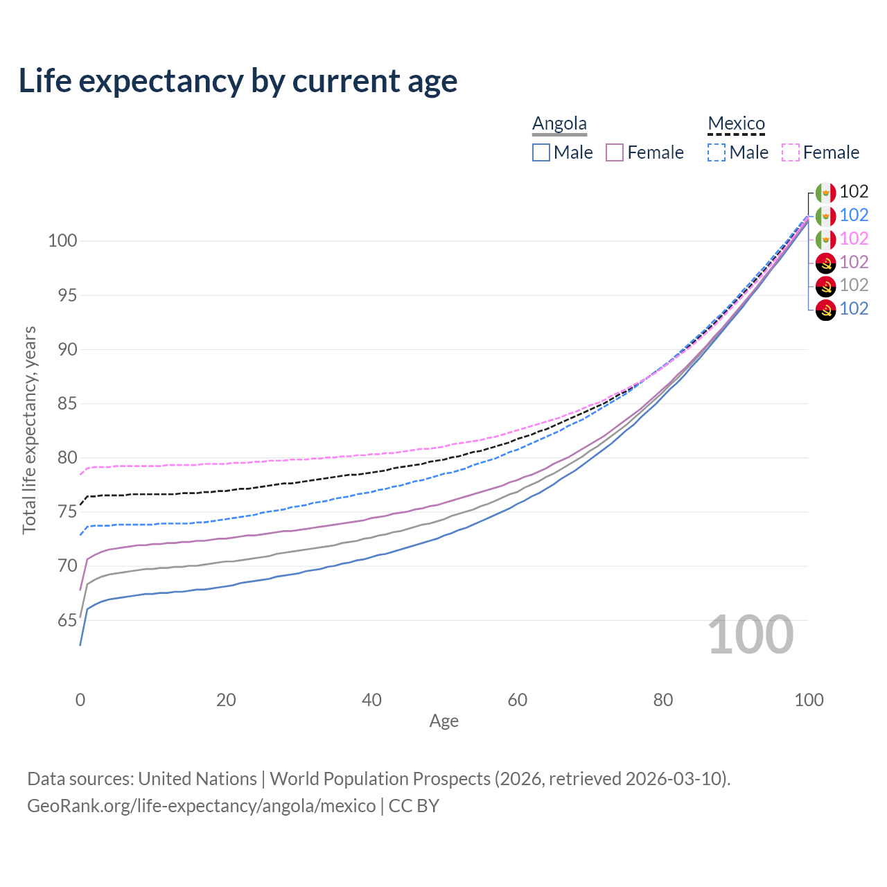 This life expectancy calculator shows the odds of living to 100, 95, 90, and below based on current age for both males and females in Angola and Mexico, along with mean and median age of death. The calculations are based on the 2026 life tables (actuarial tables) from the UN World Population Prospects.