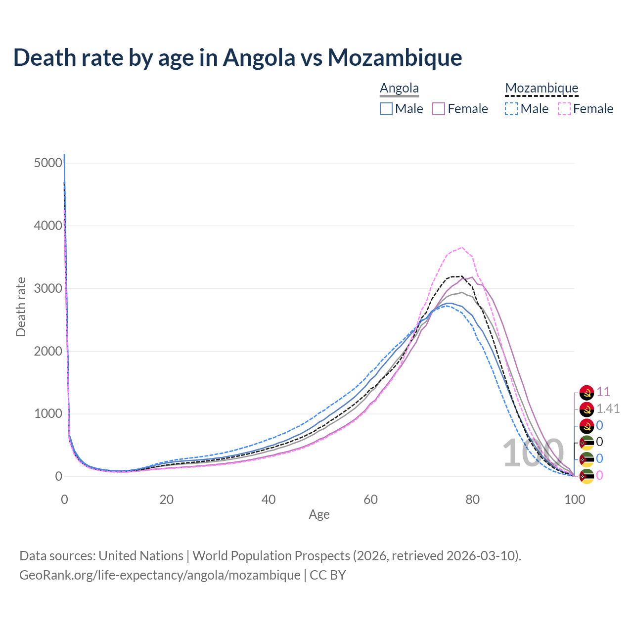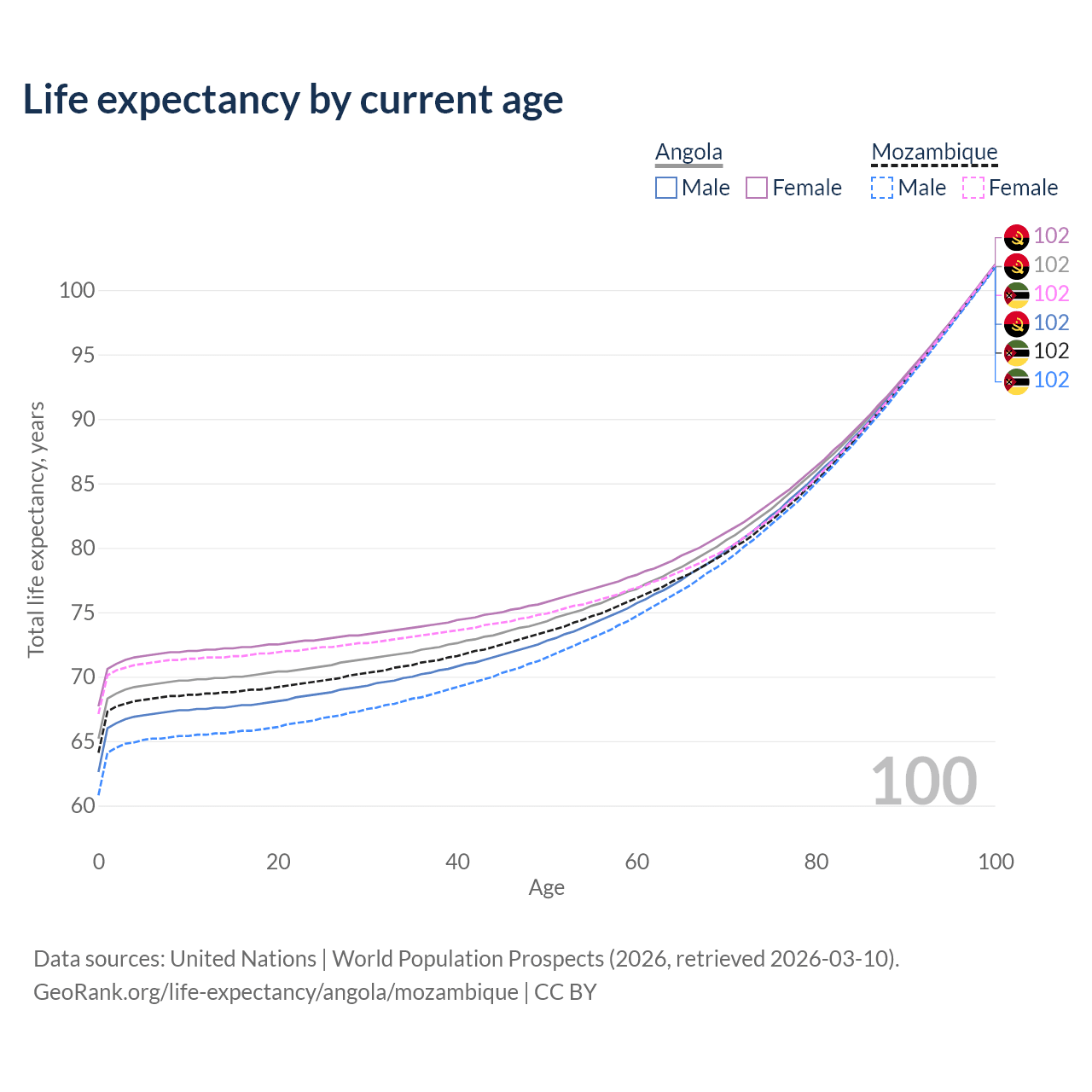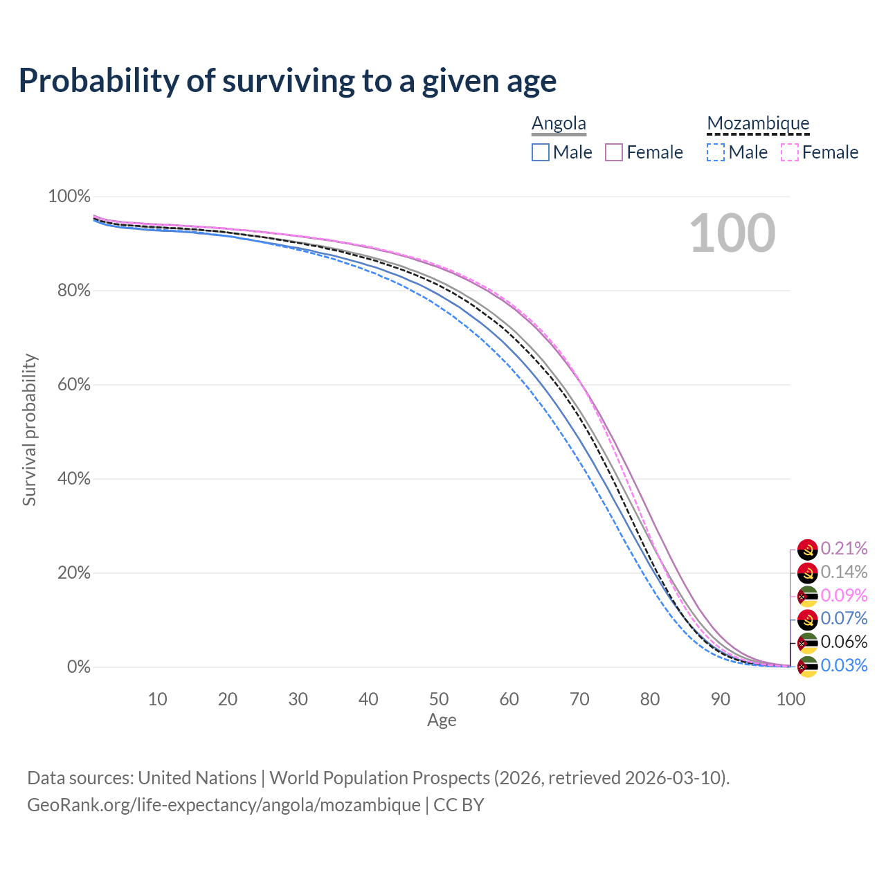 This life expectancy calculator shows the odds of living to 100, 95, 90, and below based on current age for both males and females in Angola and Mozambique, along with mean and median age of death. The calculations are based on the 2026 life tables (actuarial tables) from the UN World Population Prospects.