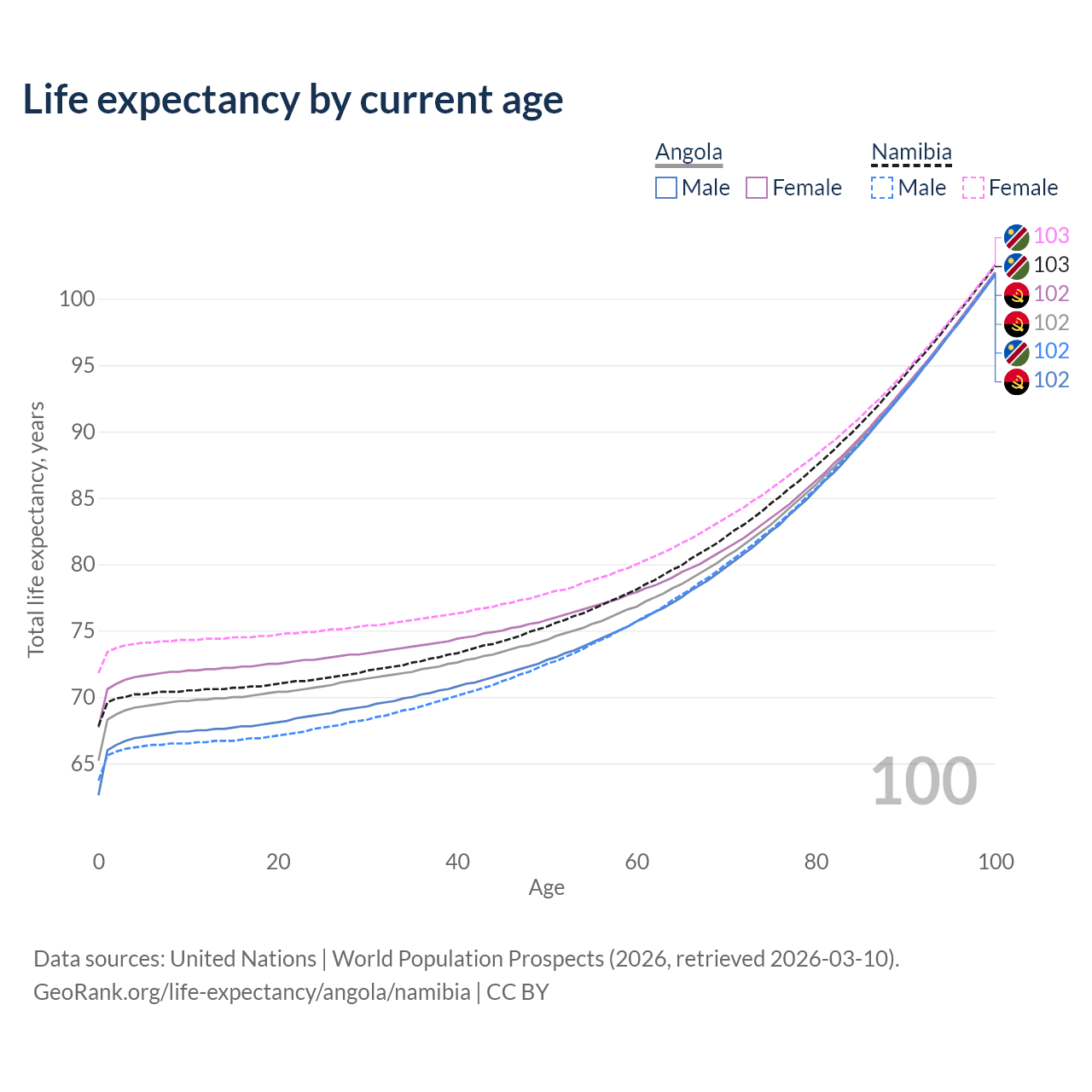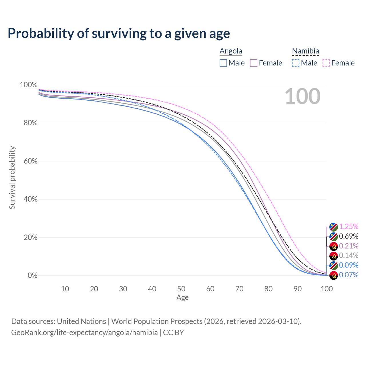 This life expectancy calculator shows the odds of living to 100, 95, 90, and below based on current age for both males and females in Angola and Namibia, along with mean and median age of death. The calculations are based on the 2026 life tables (actuarial tables) from the UN World Population Prospects.