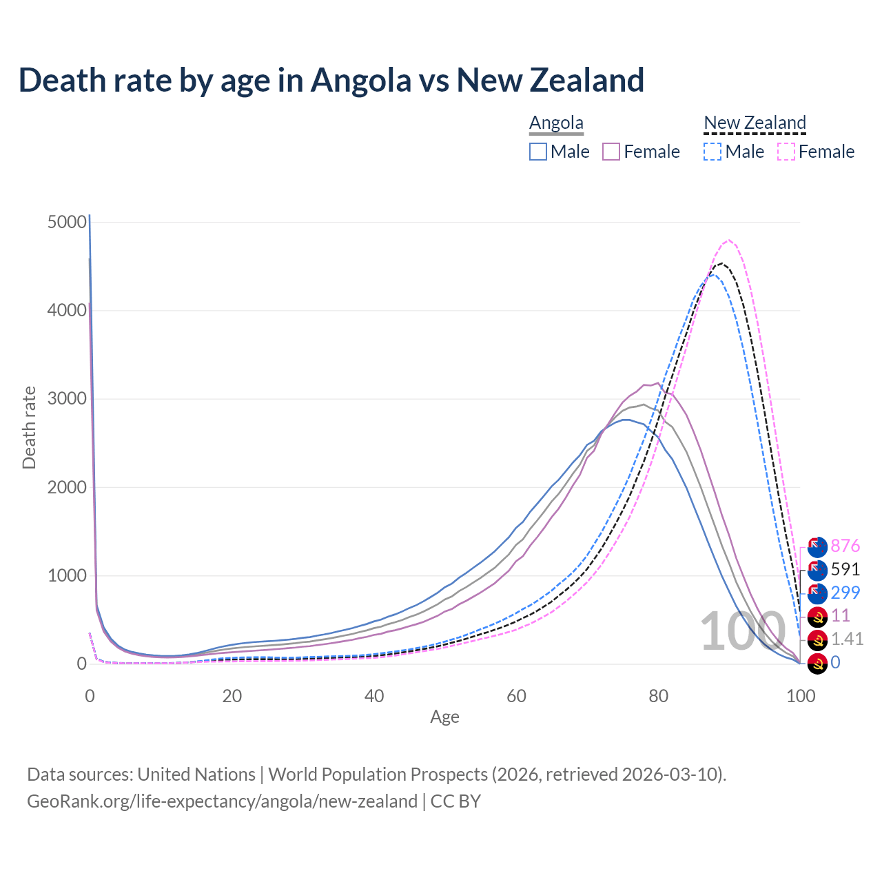 In Angola, the most common age of death is 0, compared to 89 in New Zealand. The median age of death is 71.9 in Angola and 85.8 in New Zealand, meaning only half of each cohort is expected to live past that age.