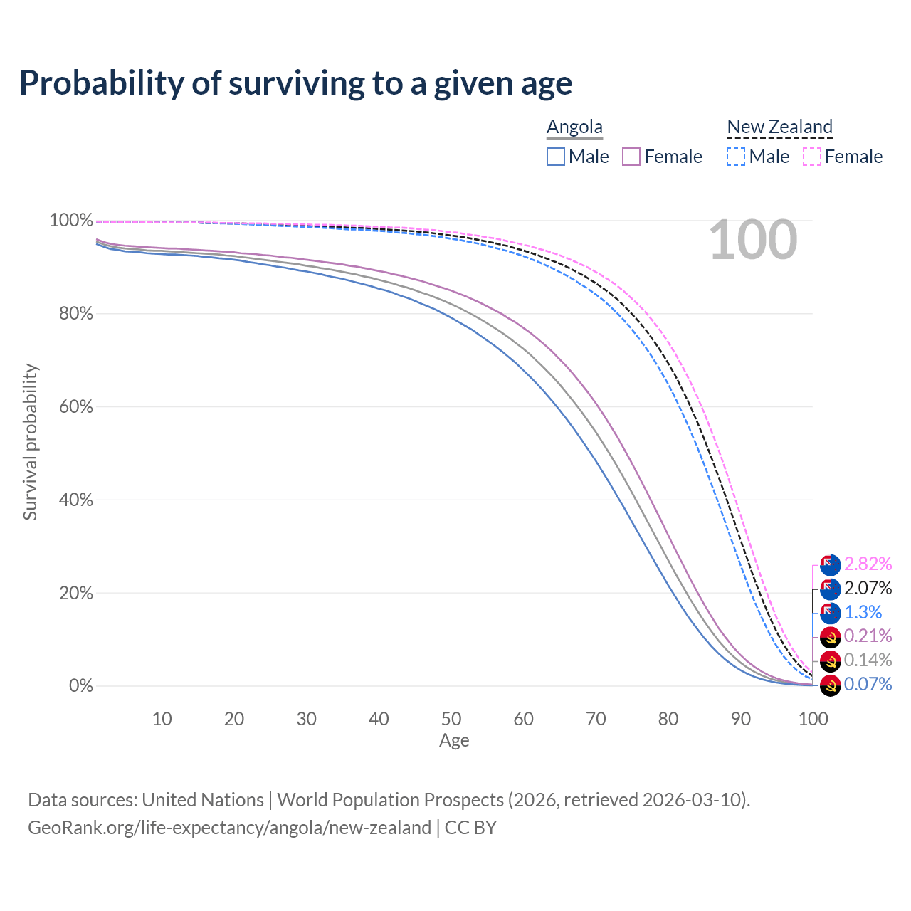 This life expectancy calculator shows the odds of living to 100, 95, 90, and below based on current age for both males and females in Angola and New Zealand, along with mean and median age of death. The calculations are based on the 2026 life tables (actuarial tables) from the UN World Population Prospects.