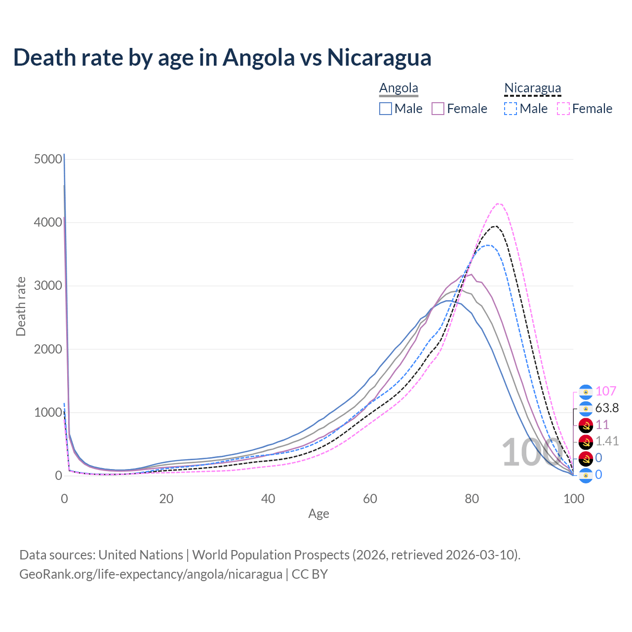 In Angola, the most common age of death is 0, compared to 85 in Nicaragua. The median age of death is 71.9 in Angola and 79.9 in Nicaragua, meaning only half of each cohort is expected to live past that age.