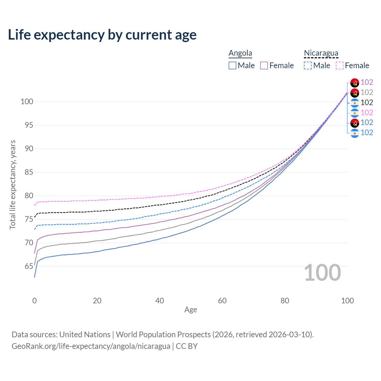 This life expectancy calculator shows the odds of living to 100, 95, 90, and below based on current age for both males and females in Angola and Nicaragua, along with mean and median age of death. The calculations are based on the 2026 life tables (actuarial tables) from the UN World Population Prospects.