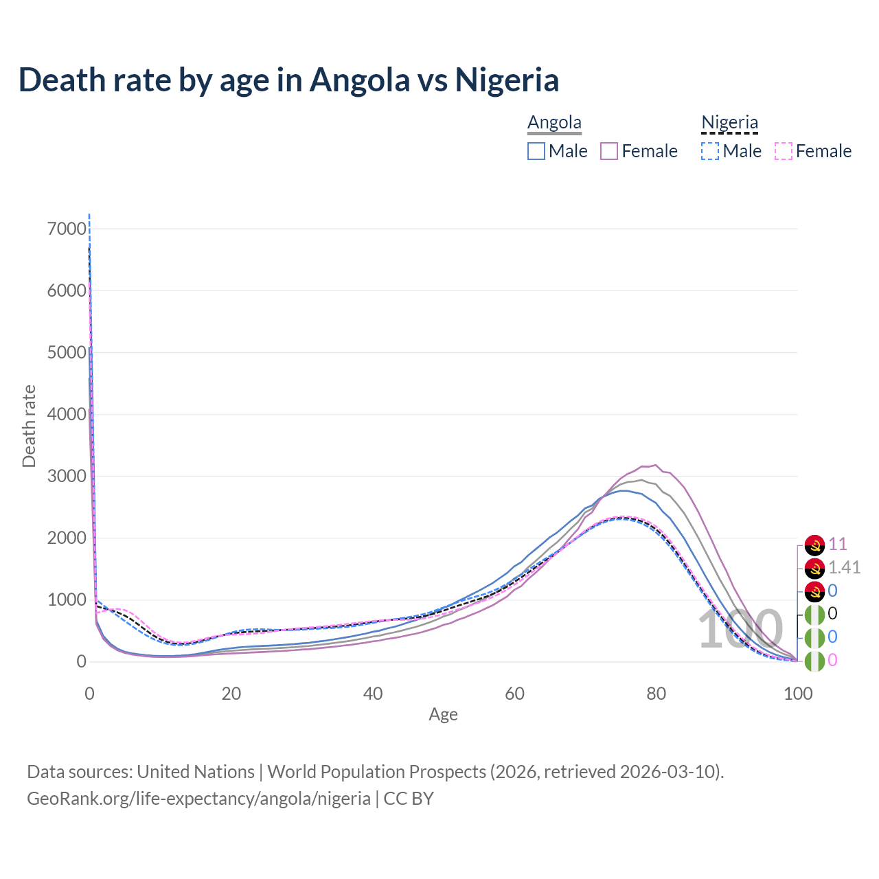 In Angola, the most common age of death is 0, compared to 0 in Nigeria. The median age of death is 71.9 in Angola and 64.3 in Nigeria, meaning only half of each cohort is expected to live past that age.