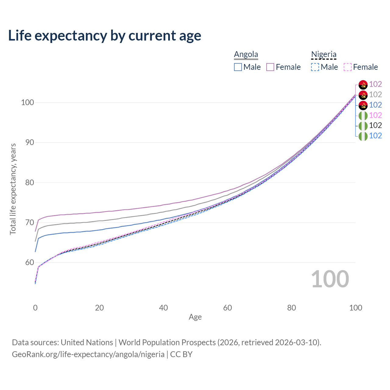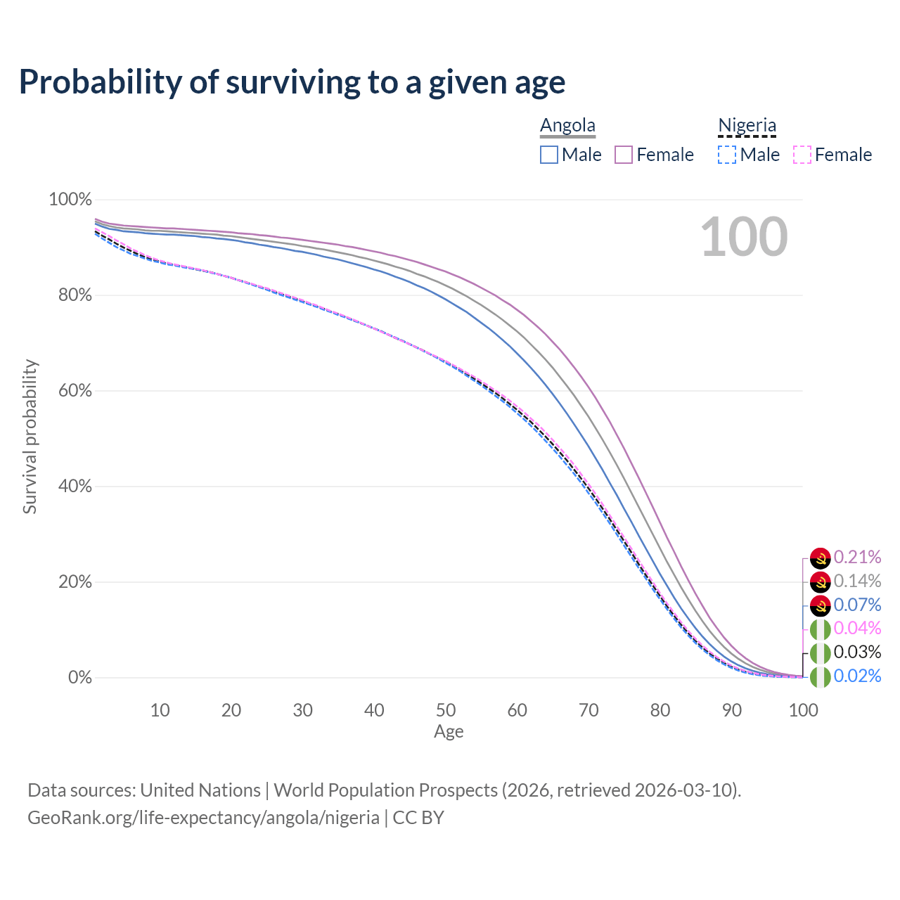This life expectancy calculator shows the odds of living to 100, 95, 90, and below based on current age for both males and females in Angola and Nigeria, along with mean and median age of death. The calculations are based on the 2026 life tables (actuarial tables) from the UN World Population Prospects.