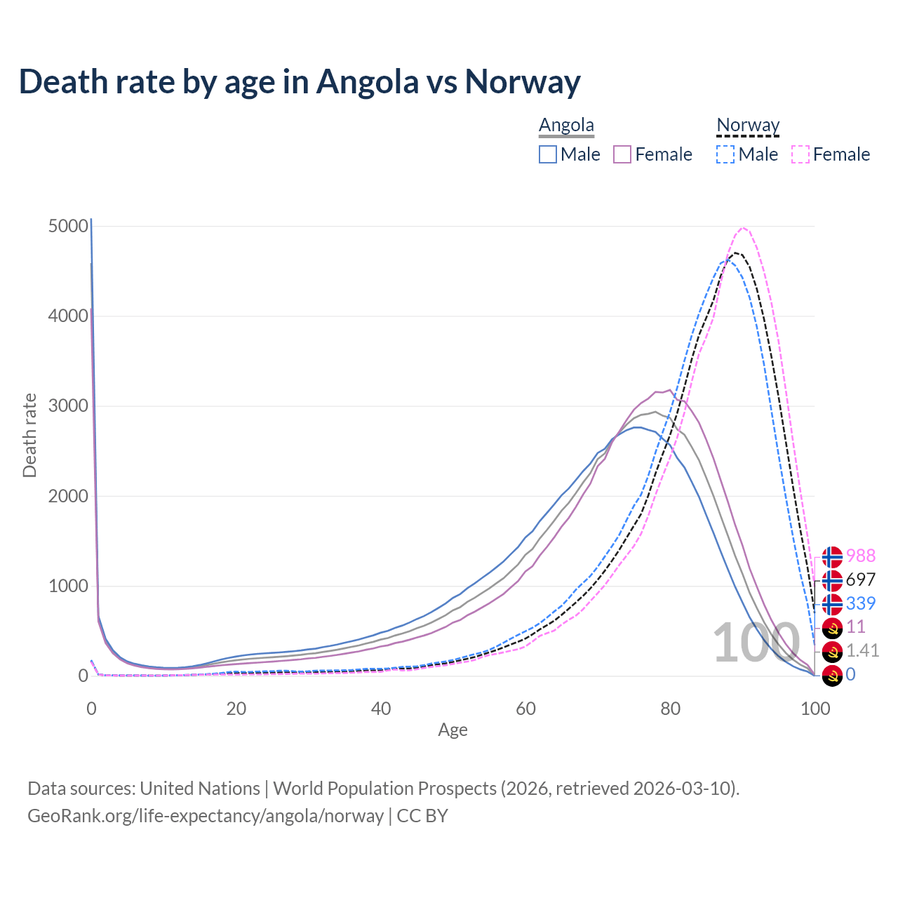 This life expectancy calculator shows the odds of living to 100, 95, 90, and below based on current age for both males and females in Angola and Norway, along with mean and median age of death. The calculations are based on the 2026 life tables (actuarial tables) from the UN World Population Prospects.