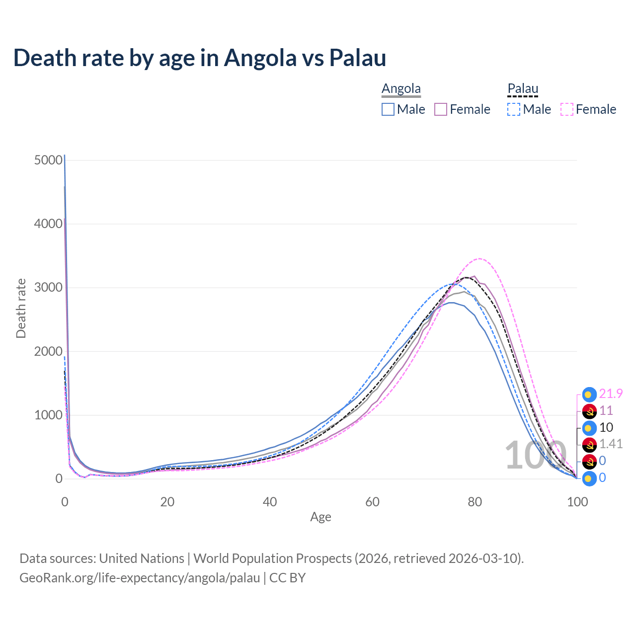 In Angola, the most common age of death is 0, compared to 78 in Palau. The median age of death is 71.9 in Angola and 73.8 in Palau, meaning only half of each cohort is expected to live past that age.