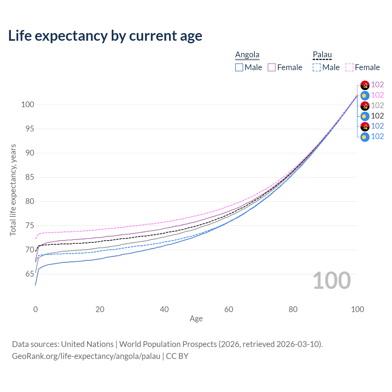 This life expectancy calculator shows the odds of living to 100, 95, 90, and below based on current age for both males and females in Angola and Palau, along with mean and median age of death. The calculations are based on the 2026 life tables (actuarial tables) from the UN World Population Prospects.