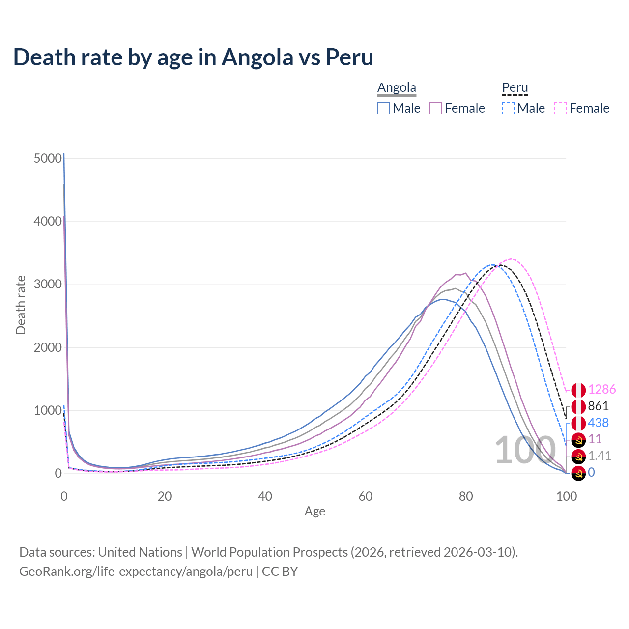 In Angola, the most common age of death is 0, compared to 87 in Peru. The median age of death is 71.9 in Angola and 82.4 in Peru, meaning only half of each cohort is expected to live past that age.