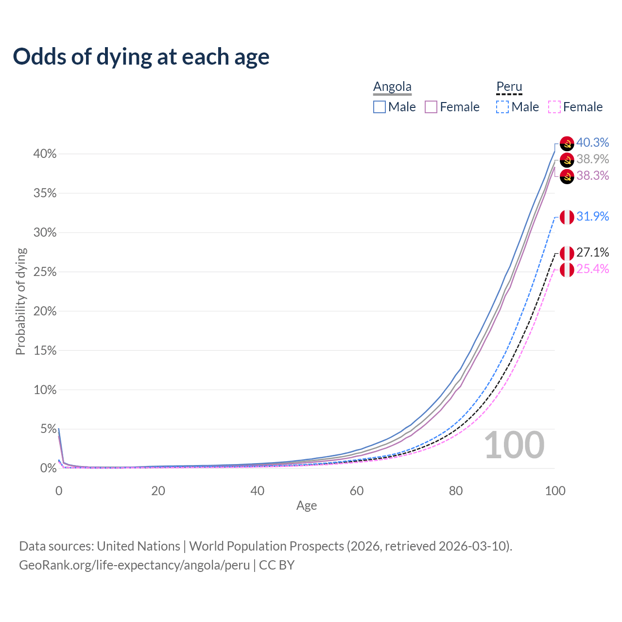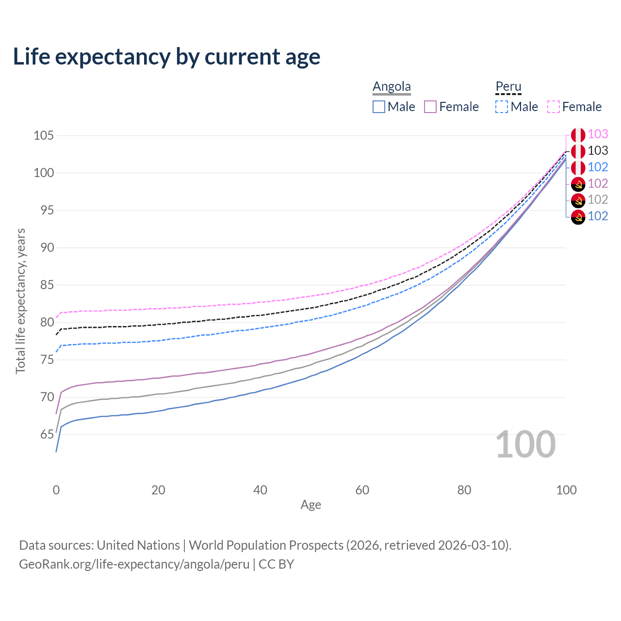 This life expectancy calculator shows the odds of living to 100, 95, 90, and below based on current age for both males and females in Angola and Peru, along with mean and median age of death. The calculations are based on the 2026 life tables (actuarial tables) from the UN World Population Prospects.