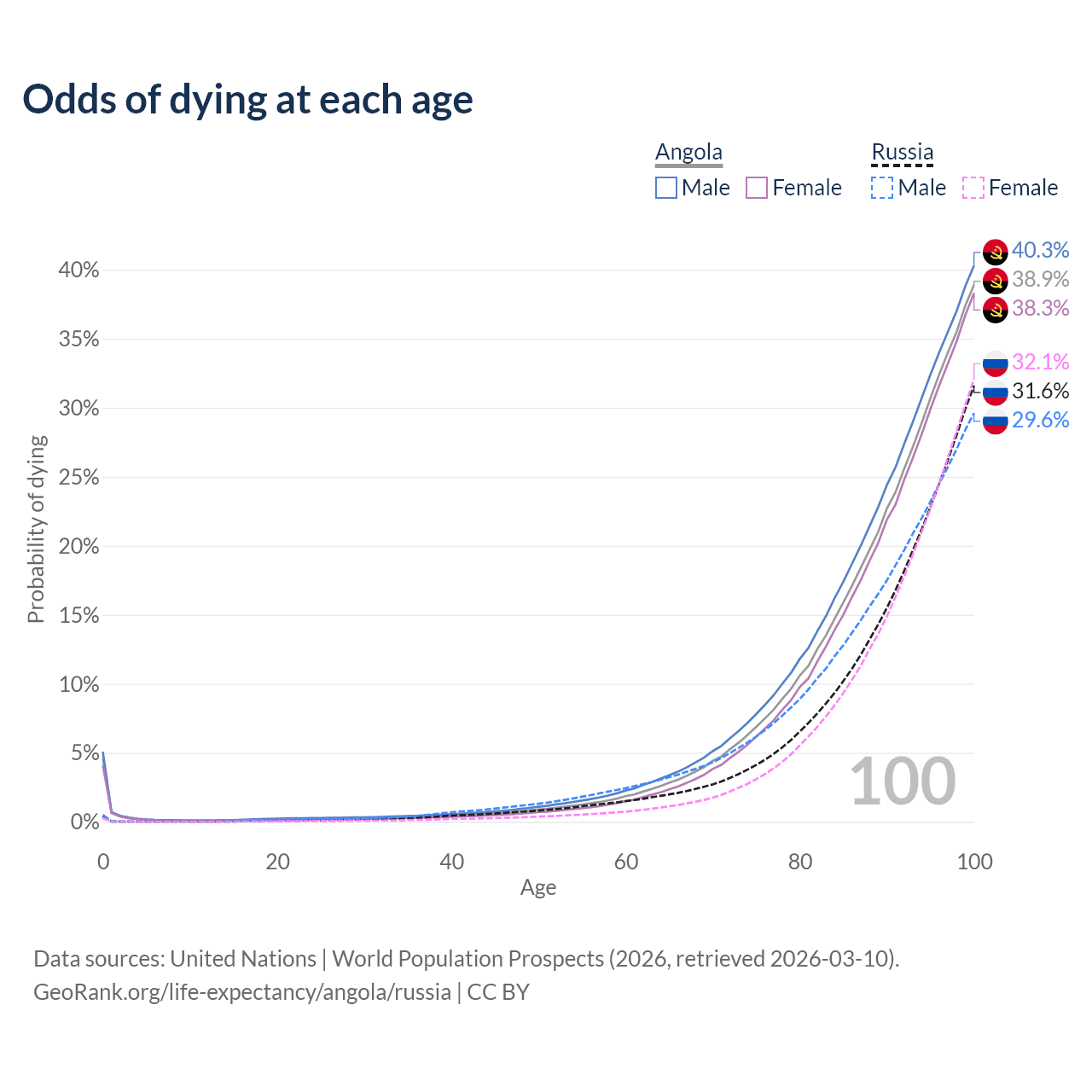 This life expectancy calculator shows the odds of living to 100, 95, 90, and below based on current age for both males and females in Angola and Russia, along with mean and median age of death. The calculations are based on the 2026 life tables (actuarial tables) from the UN World Population Prospects.