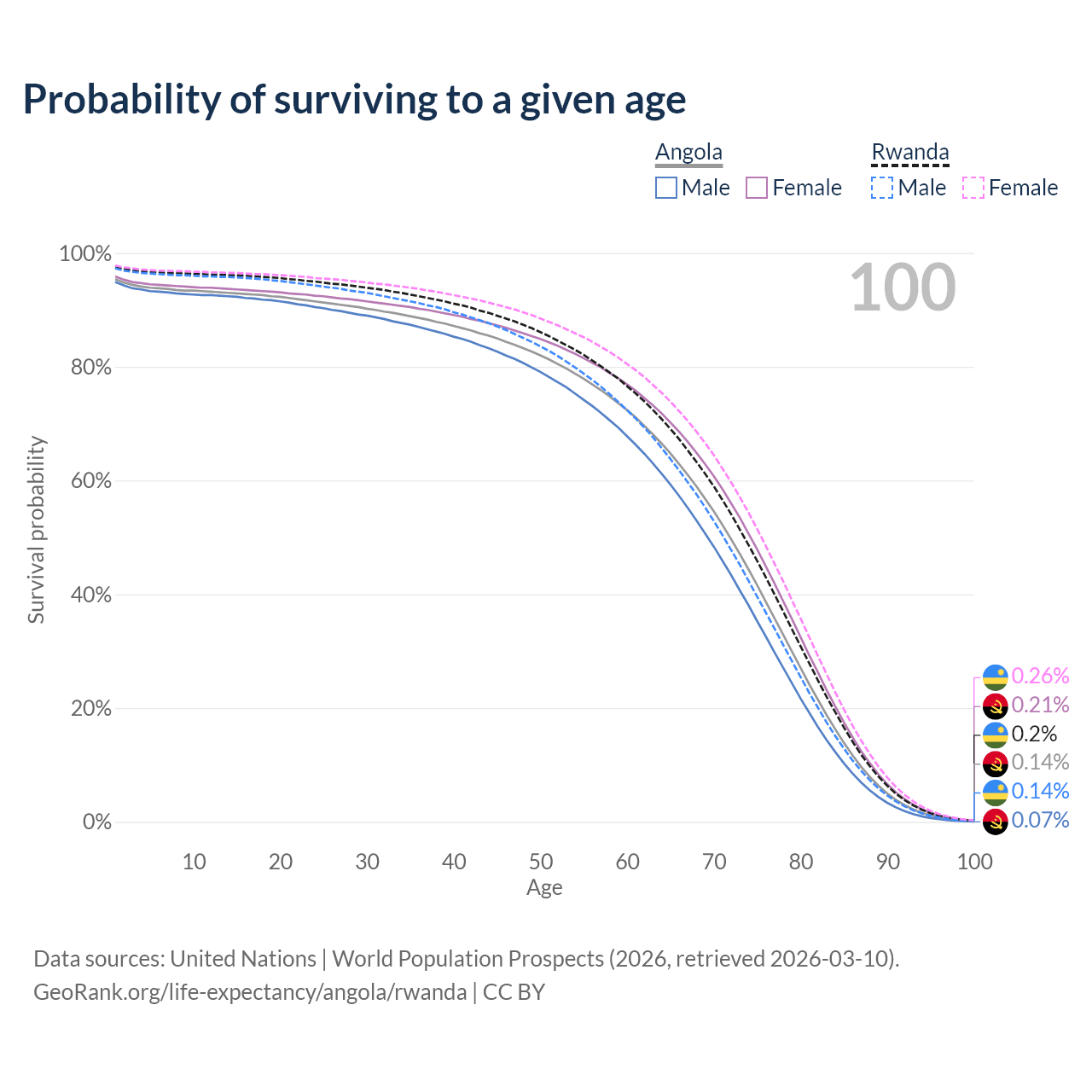 This life expectancy calculator shows the odds of living to 100, 95, 90, and below based on current age for both males and females in Angola and Rwanda, along with mean and median age of death. The calculations are based on the 2026 life tables (actuarial tables) from the UN World Population Prospects.