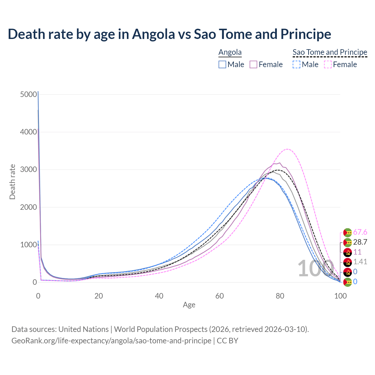 In Angola, the most common age of death is 0, compared to 79 in Sao Tome and Principe. The median age of death is 71.9 in Angola and 74.1 in Sao Tome and Principe, meaning only half of each cohort is expected to live past that age.