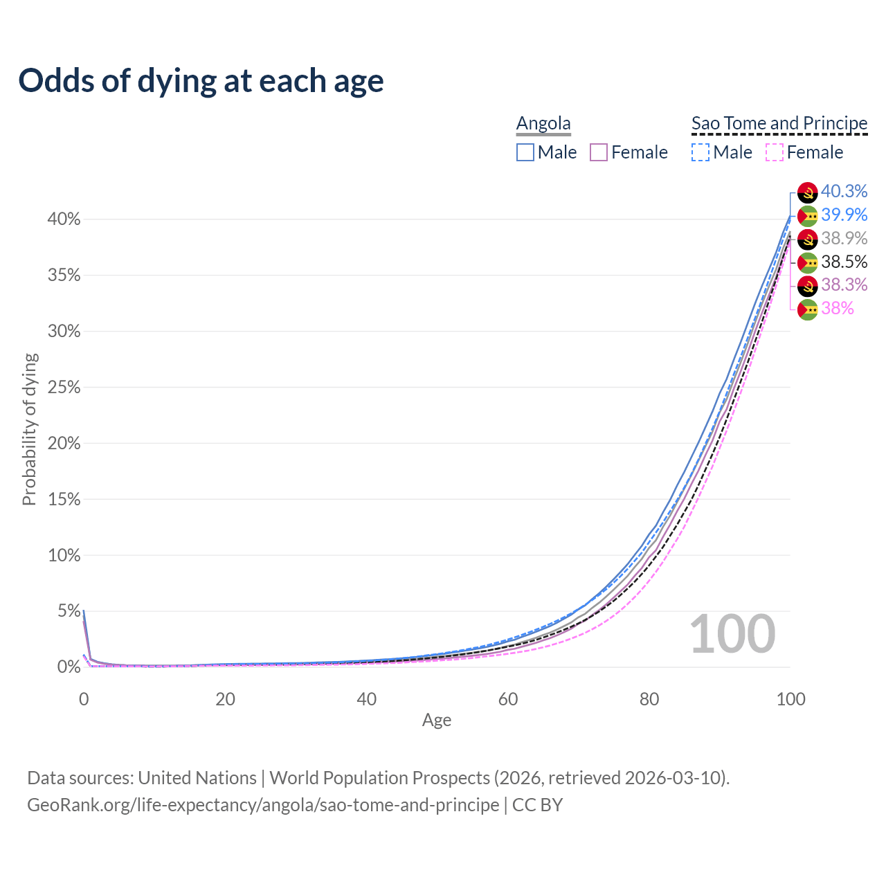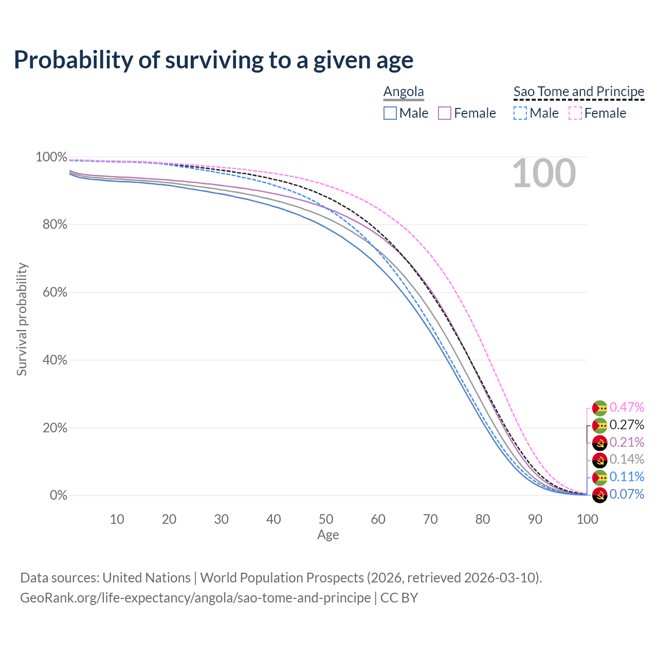 This life expectancy calculator shows the odds of living to 100, 95, 90, and below based on current age for both males and females in Angola and Sao Tome and Principe, along with mean and median age of death. The calculations are based on the 2026 life tables (actuarial tables) from the UN World Population Prospects.