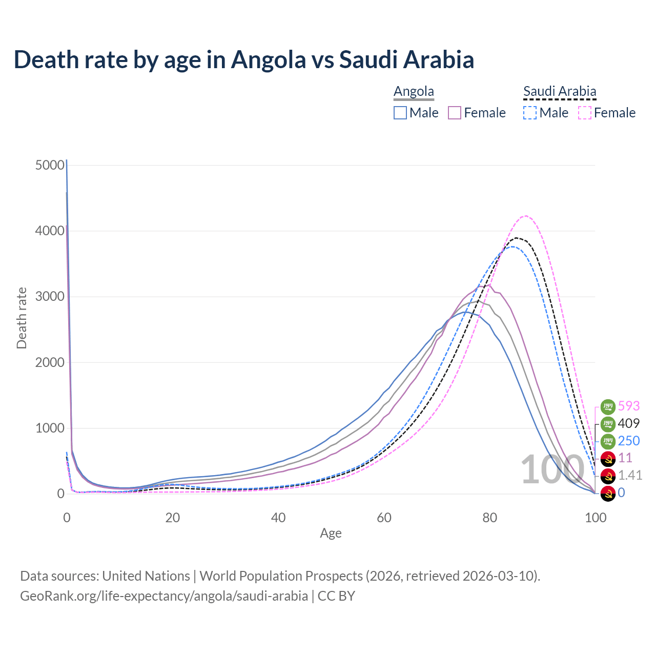In Angola, the most common age of death is 0, compared to 85 in Saudi Arabia. The median age of death is 71.9 in Angola and 82.5 in Saudi Arabia, meaning only half of each cohort is expected to live past that age.
