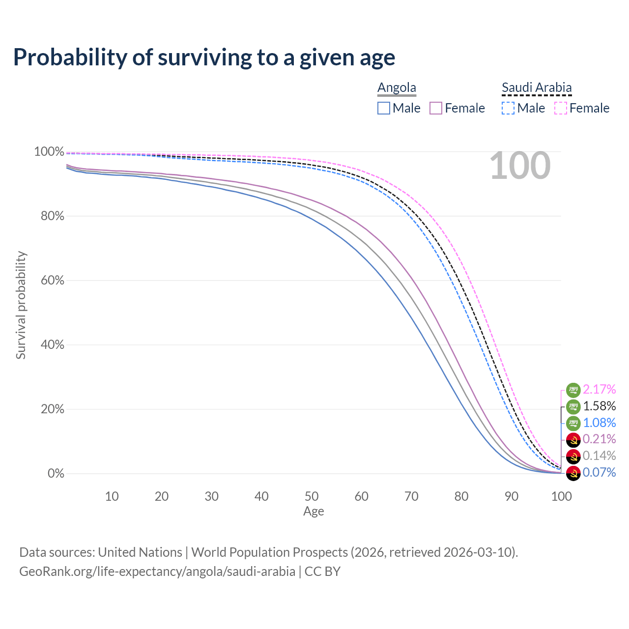 This life expectancy calculator shows the odds of living to 100, 95, 90, and below based on current age for both males and females in Angola and Saudi Arabia, along with mean and median age of death. The calculations are based on the 2026 life tables (actuarial tables) from the UN World Population Prospects.