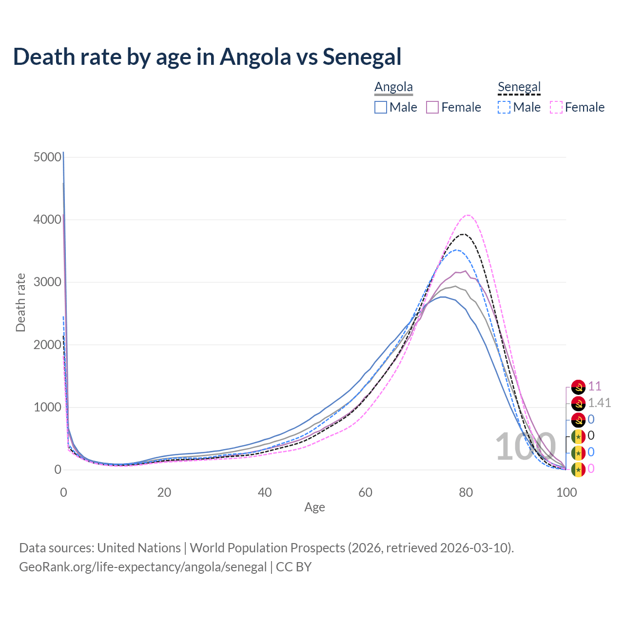 In Angola, the most common age of death is 0, compared to 80 in Senegal. The median age of death is 71.9 in Angola and 75 in Senegal, meaning only half of each cohort is expected to live past that age.