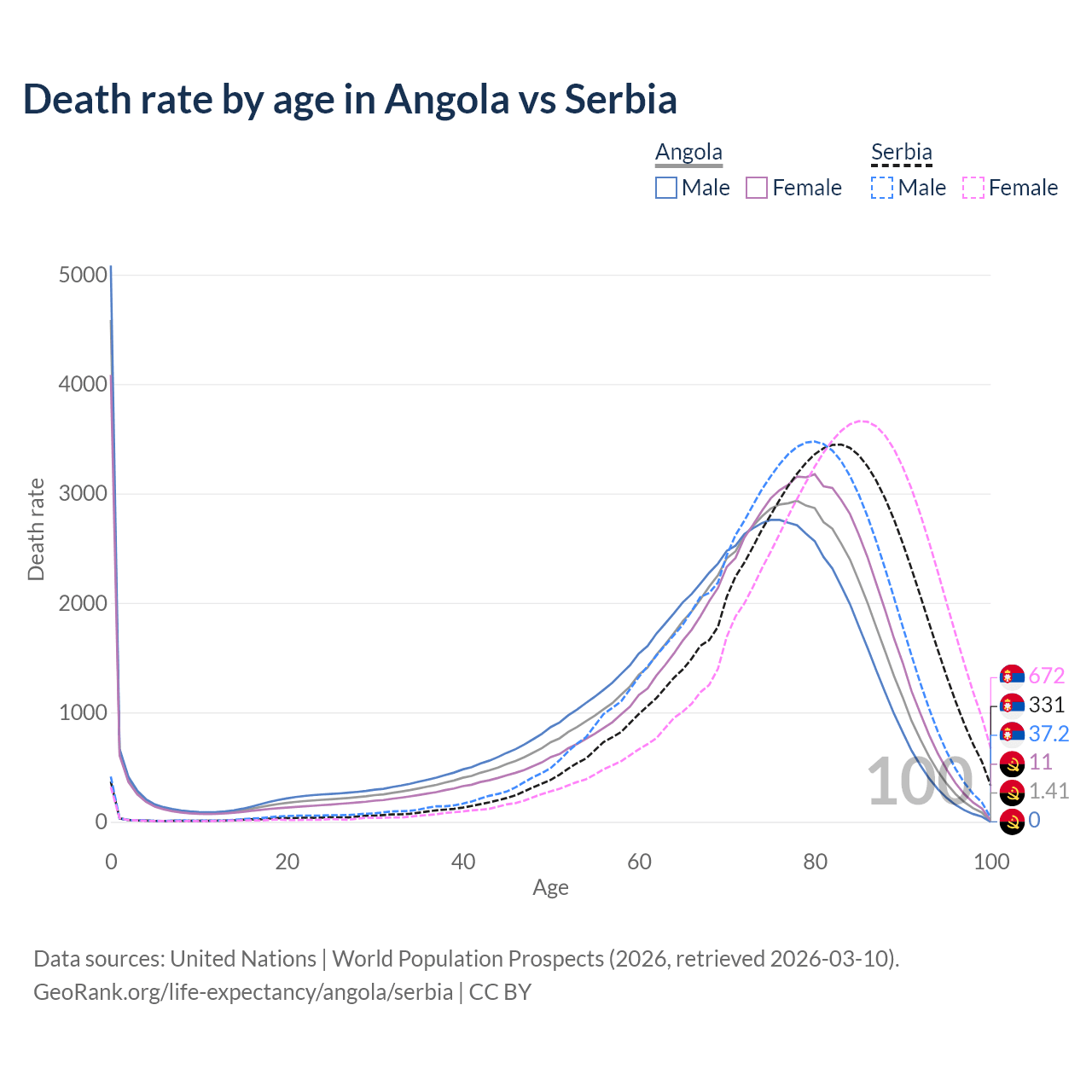 In Angola, the most common age of death is 0, compared to 83 in Serbia. The median age of death is 71.9 in Angola and 79.6 in Serbia, meaning only half of each cohort is expected to live past that age.