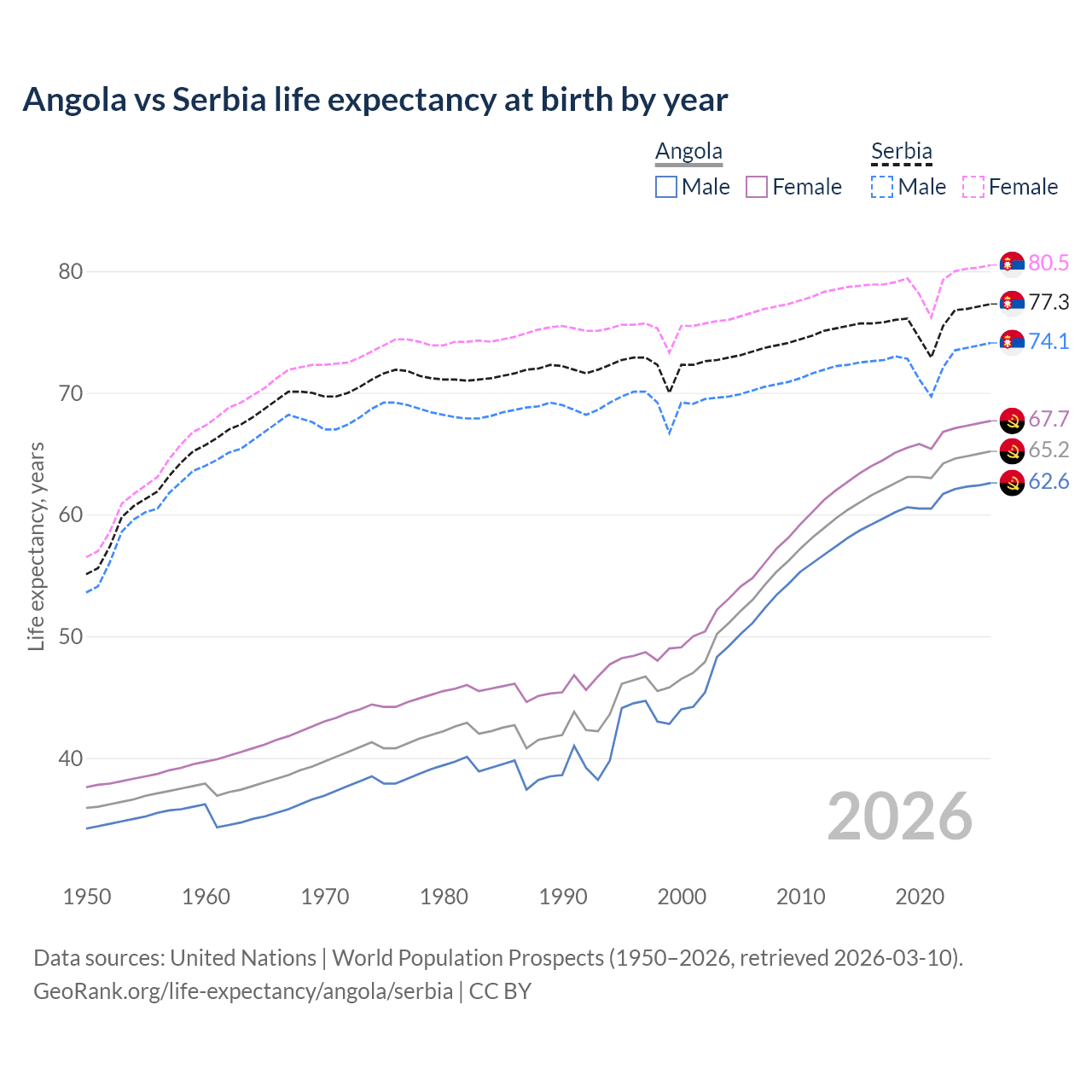 The average life expectancy at birth is 65.2 years in Angola vs 77.3 in Serbia. Angola is ranked 171/197 by life expectancy, and Serbia is 72/197. In Angola, the life expectancy is 62.6 years for males and 67.7 years for females. In Serbia, it's 74.1 years for males and 80.5 years for females.
