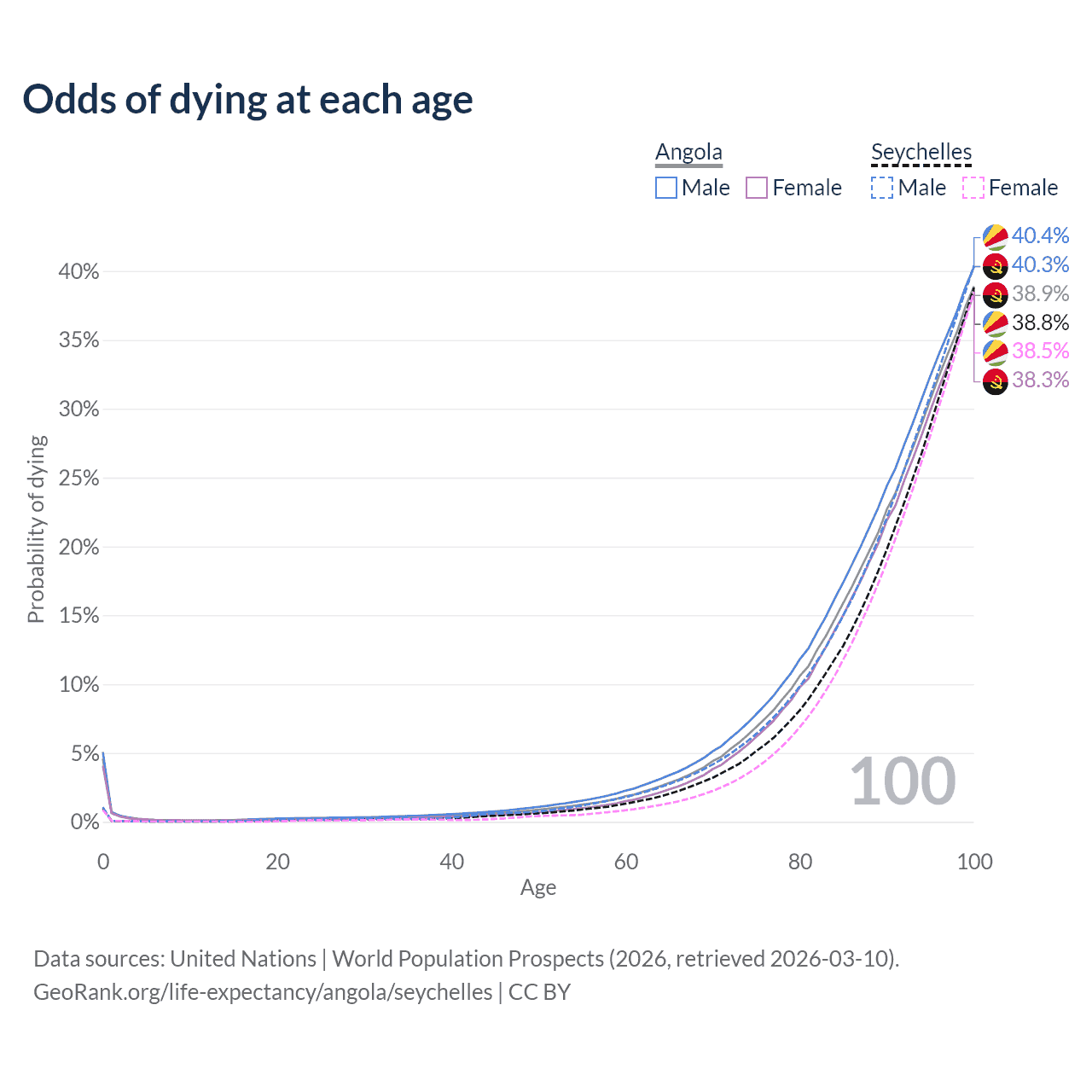 This life expectancy calculator shows the odds of living to 100, 95, 90, and below based on current age for both males and females in Angola and the Seychelles, along with mean and median age of death. The calculations are based on the 2026 life tables (actuarial tables) from the UN World Population Prospects.