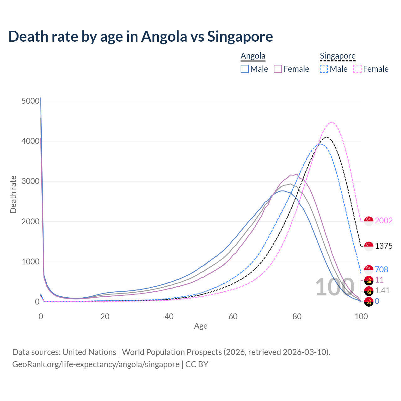 This life expectancy calculator shows the odds of living to 100, 95, 90, and below based on current age for both males and females in Angola and Singapore, along with mean and median age of death. The calculations are based on the 2026 life tables (actuarial tables) from the UN World Population Prospects.