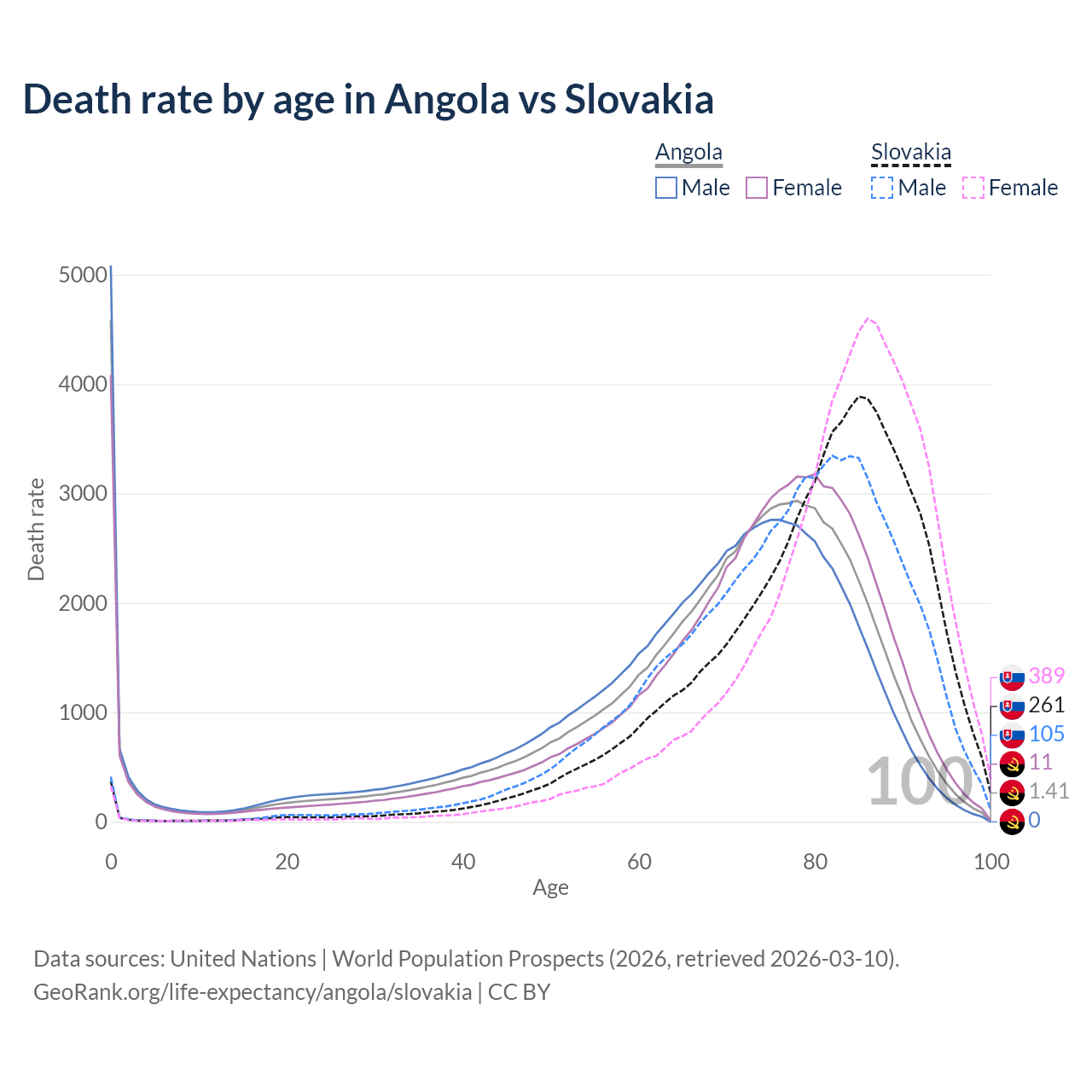 In Angola, the most common age of death is 0, compared to 85 in Slovakia. The median age of death is 71.9 in Angola and 82 in Slovakia, meaning only half of each cohort is expected to live past that age.