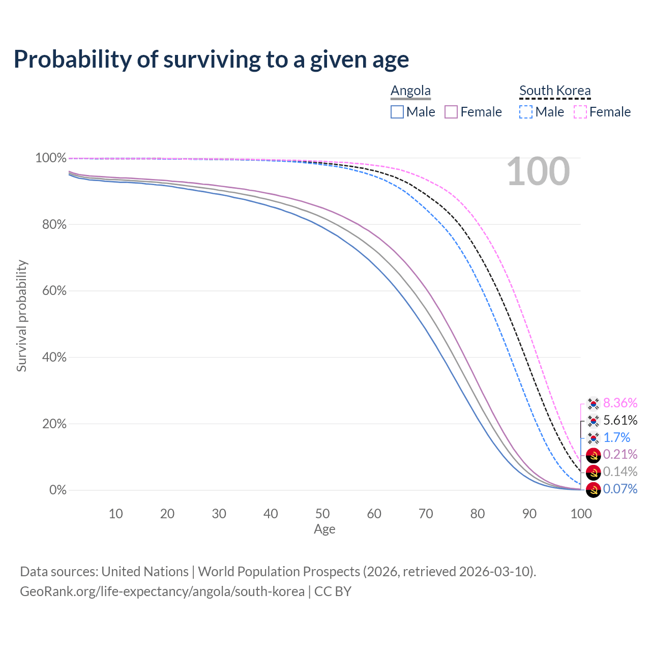 This life expectancy calculator shows the odds of living to 100, 95, 90, and below based on current age for both males and females in Angola and South Korea, along with mean and median age of death. The calculations are based on the 2026 life tables (actuarial tables) from the UN World Population Prospects.