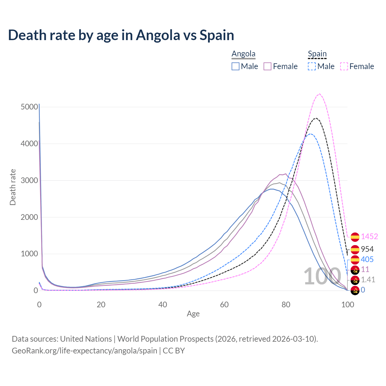 In Angola, the most common age of death is 0, compared to 90 in Spain. The median age of death is 71.9 in Angola and 87 in Spain, meaning only half of each cohort is expected to live past that age.