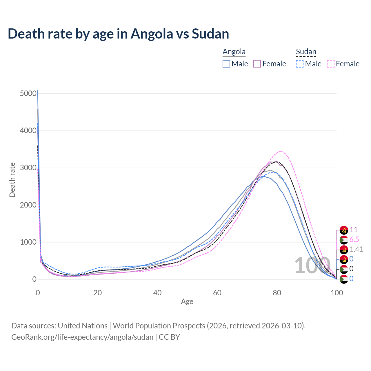 The average life expectancy at birth is 65.2 years in Angola vs 66.9 in Sudan. Angola is ranked 171/197 by life expectancy, and Sudan is 160/197. In Angola, the life expectancy is 62.6 years for males and 67.7 years for females. In Sudan, it's 63.8 years for males and 70.2 years for females.