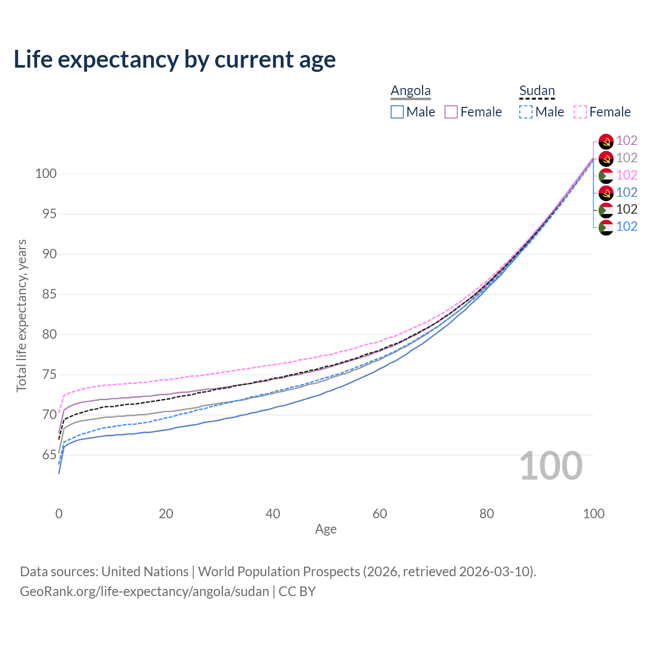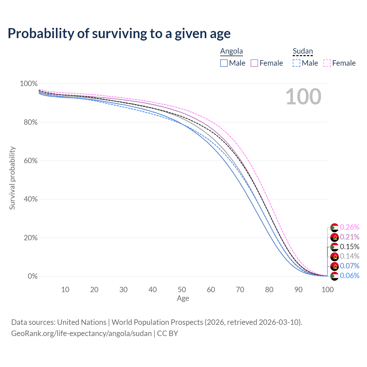 This life expectancy calculator shows the odds of living to 100, 95, 90, and below based on current age for both males and females in Angola and Sudan, along with mean and median age of death. The calculations are based on the 2026 life tables (actuarial tables) from the UN World Population Prospects.