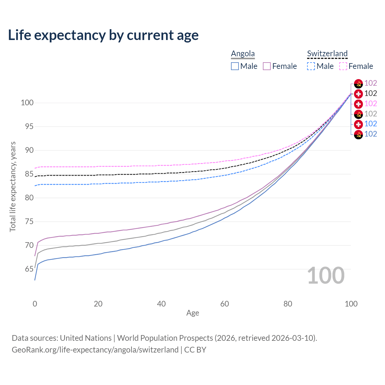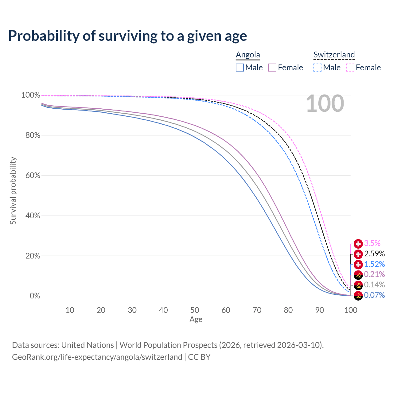 This life expectancy calculator shows the odds of living to 100, 95, 90, and below based on current age for both males and females in Angola and Switzerland, along with mean and median age of death. The calculations are based on the 2026 life tables (actuarial tables) from the UN World Population Prospects.