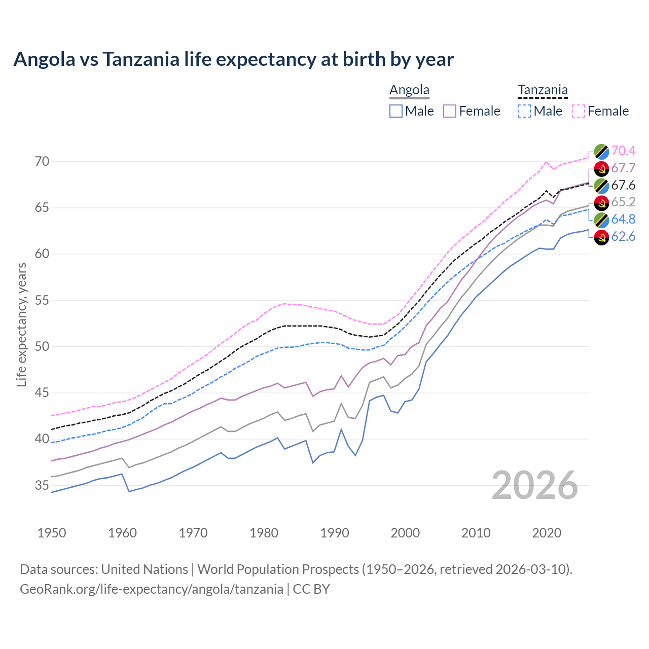The average life expectancy at birth is 65.2 years in Angola vs 67.6 in Tanzania. Angola is ranked 171/197 by life expectancy, and Tanzania is 155/197. In Angola, the life expectancy is 62.6 years for males and 67.7 years for females. In Tanzania, it's 64.8 years for males and 70.4 years for females.