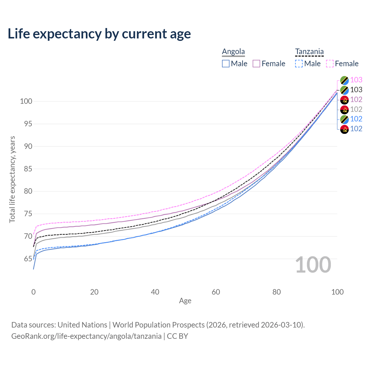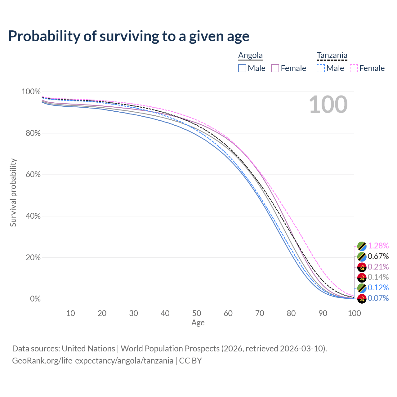 This life expectancy calculator shows the odds of living to 100, 95, 90, and below based on current age for both males and females in Angola and Tanzania, along with mean and median age of death. The calculations are based on the 2026 life tables (actuarial tables) from the UN World Population Prospects.