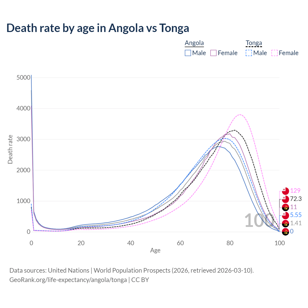 In Angola, the most common age of death is 0, compared to 82 in Tonga. The median age of death is 71.9 in Angola and 77 in Tonga, meaning only half of each cohort is expected to live past that age.
