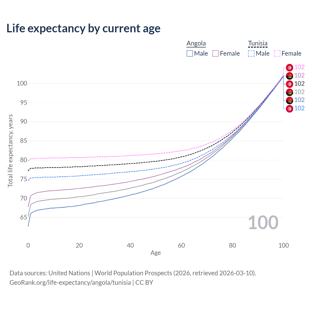 This life expectancy calculator shows the odds of living to 100, 95, 90, and below based on current age for both males and females in Angola and Tunisia, along with mean and median age of death. The calculations are based on the 2026 life tables (actuarial tables) from the UN World Population Prospects.