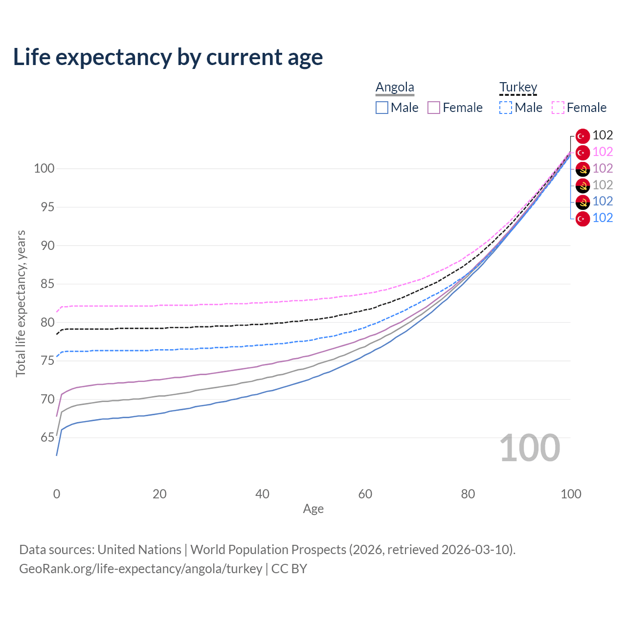 This life expectancy calculator shows the odds of living to 100, 95, 90, and below based on current age for both males and females in Angola and Turkey, along with mean and median age of death. The calculations are based on the 2026 life tables (actuarial tables) from the UN World Population Prospects.