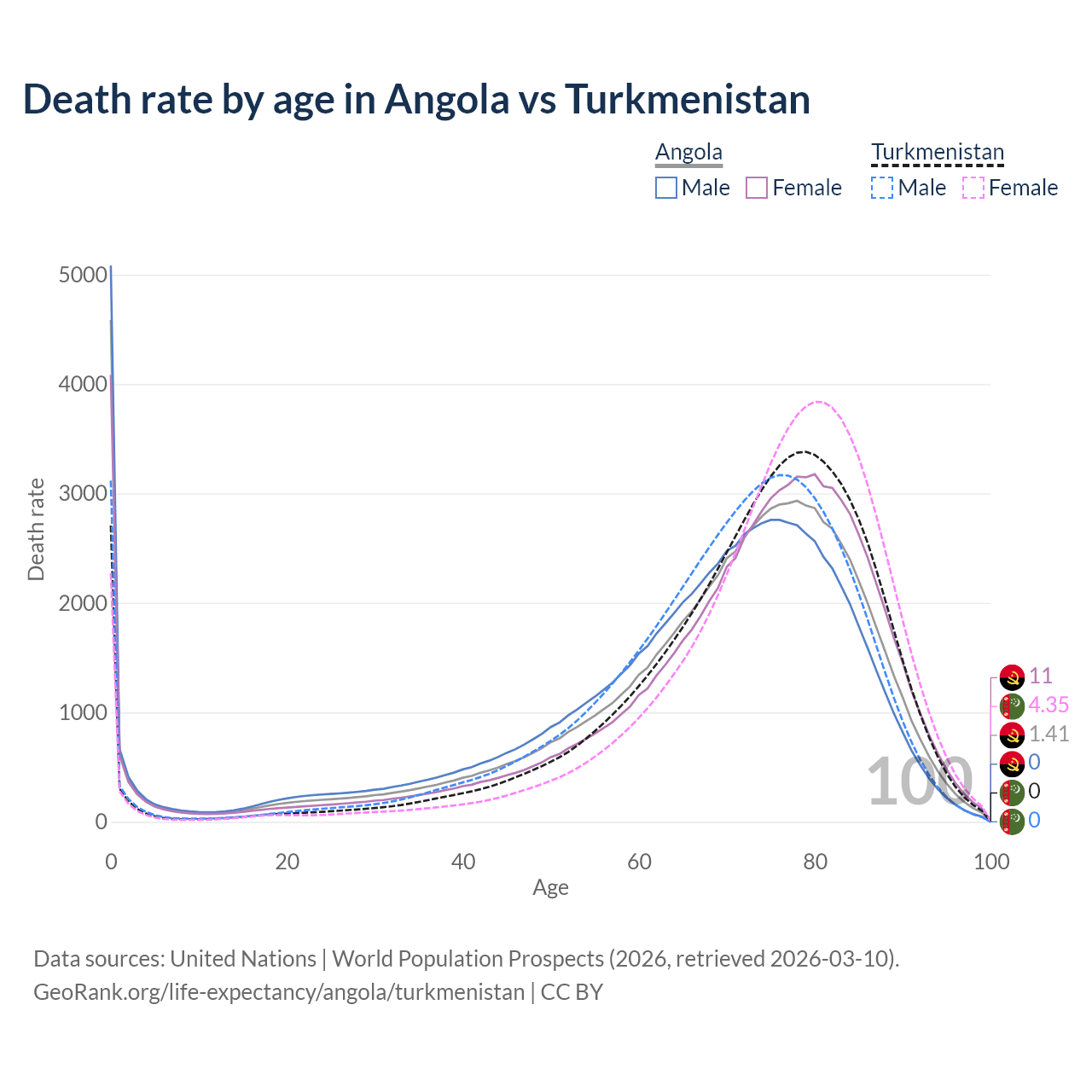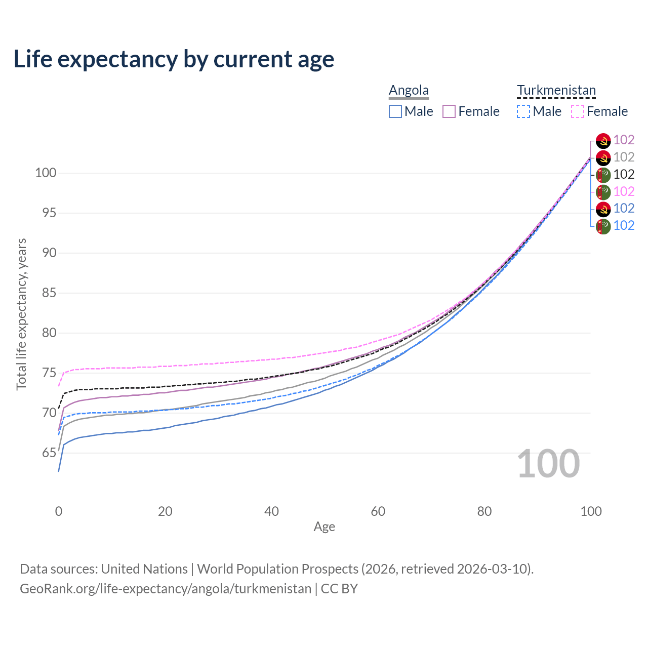This life expectancy calculator shows the odds of living to 100, 95, 90, and below based on current age for both males and females in Angola and Turkmenistan, along with mean and median age of death. The calculations are based on the 2026 life tables (actuarial tables) from the UN World Population Prospects.