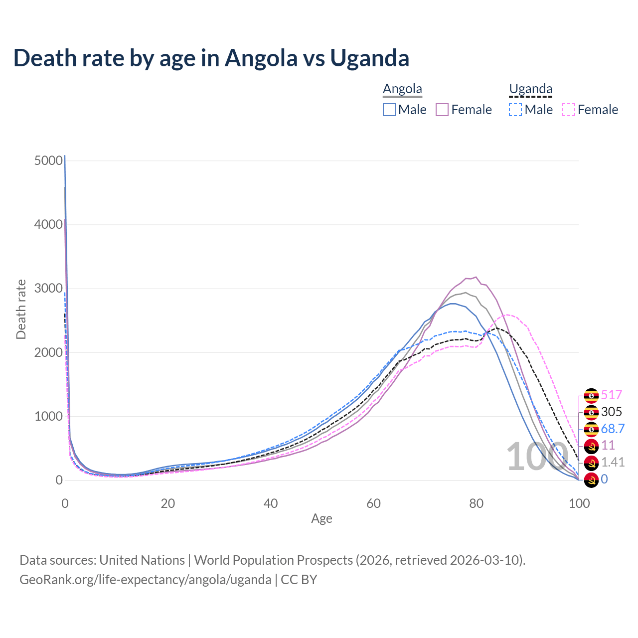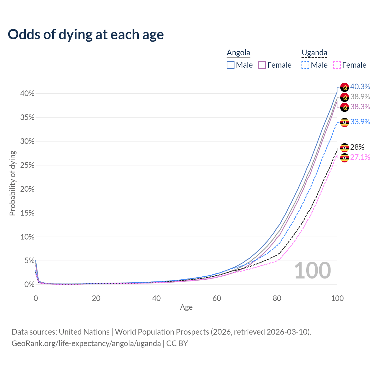 This life expectancy calculator shows the odds of living to 100, 95, 90, and below based on current age for both males and females in Angola and Uganda, along with mean and median age of death. The calculations are based on the 2026 life tables (actuarial tables) from the UN World Population Prospects.
