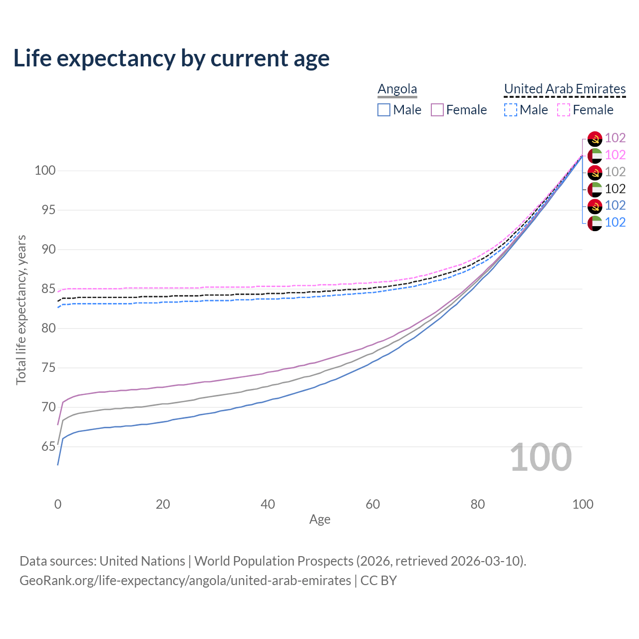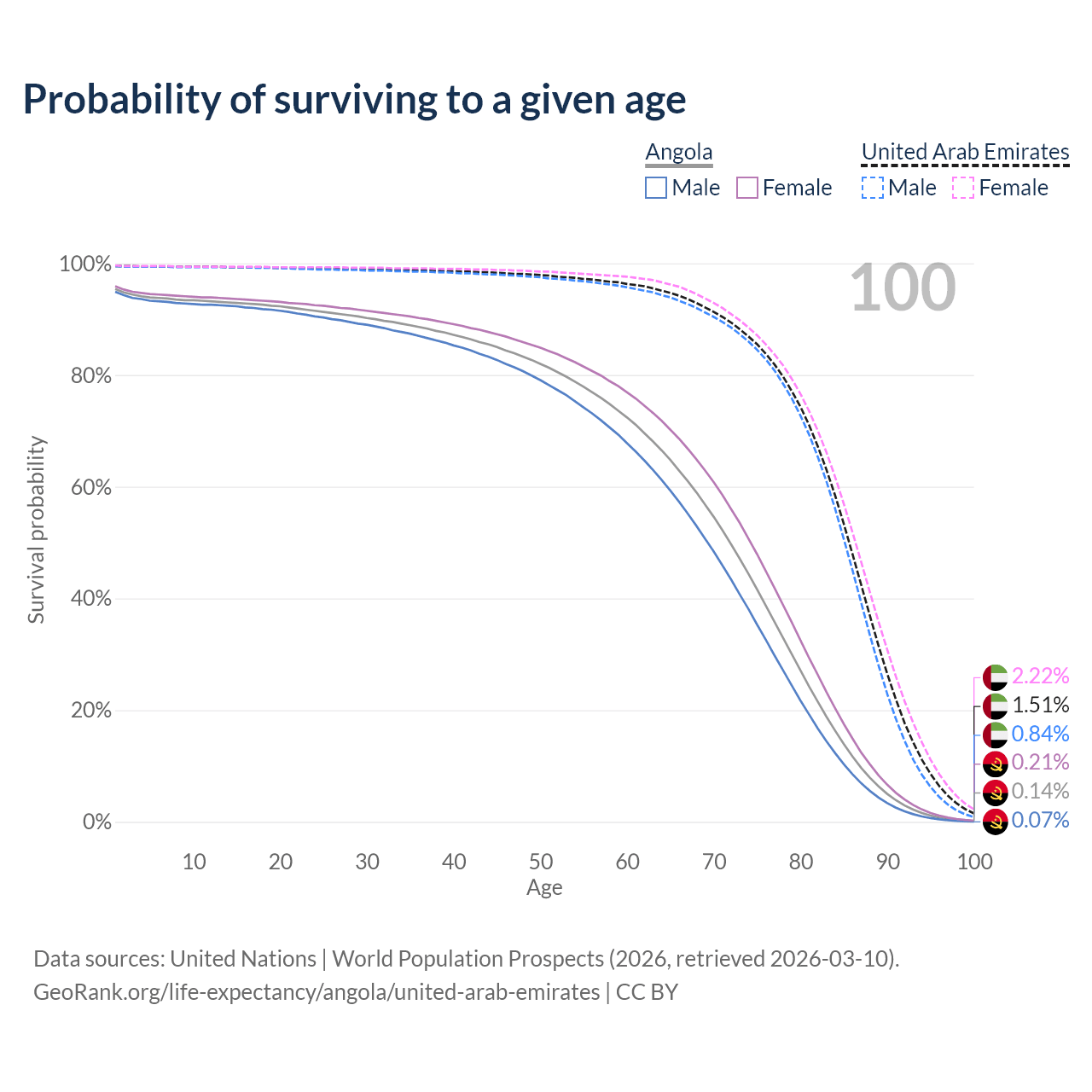 This life expectancy calculator shows the odds of living to 100, 95, 90, and below based on current age for both males and females in Angola and the United Arab Emirates, along with mean and median age of death. The calculations are based on the 2026 life tables (actuarial tables) from the UN World Population Prospects.
