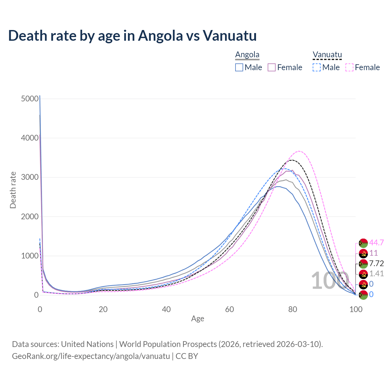 In Angola, the most common age of death is 0, compared to 80 in Vanuatu. The median age of death is 71.9 in Angola and 75.9 in Vanuatu, meaning only half of each cohort is expected to live past that age.
