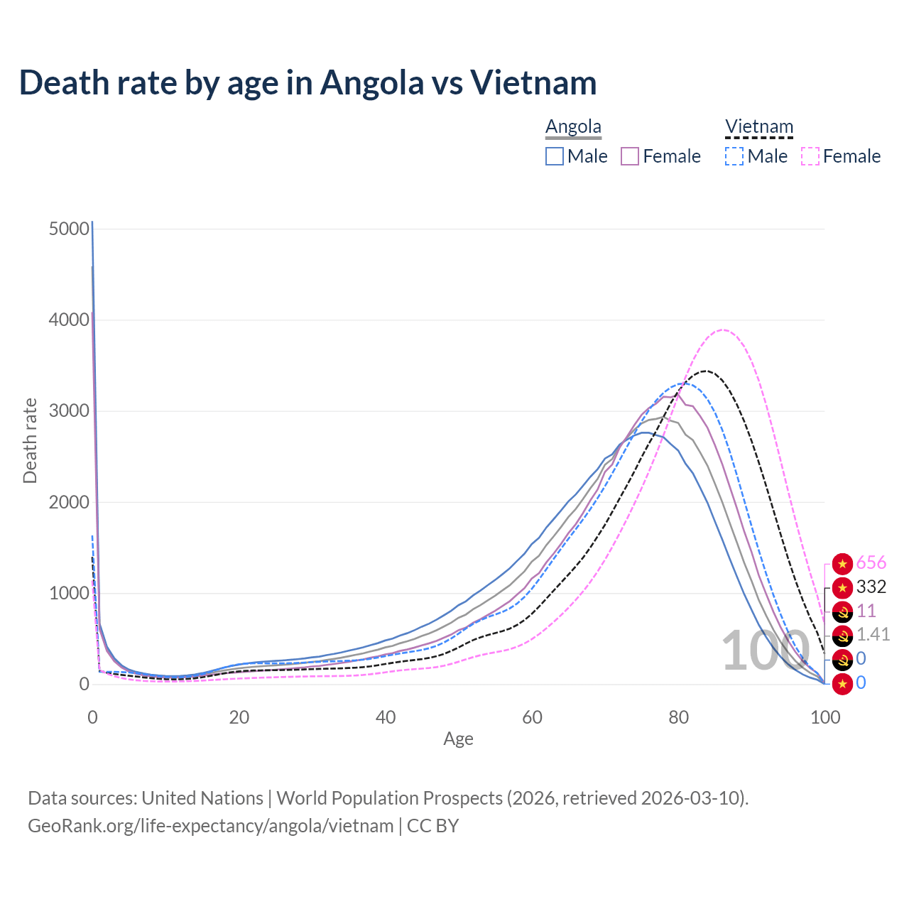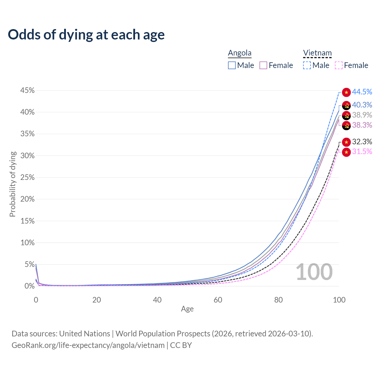 This life expectancy calculator shows the odds of living to 100, 95, 90, and below based on current age for both males and females in Angola and Vietnam, along with mean and median age of death. The calculations are based on the 2026 life tables (actuarial tables) from the UN World Population Prospects.