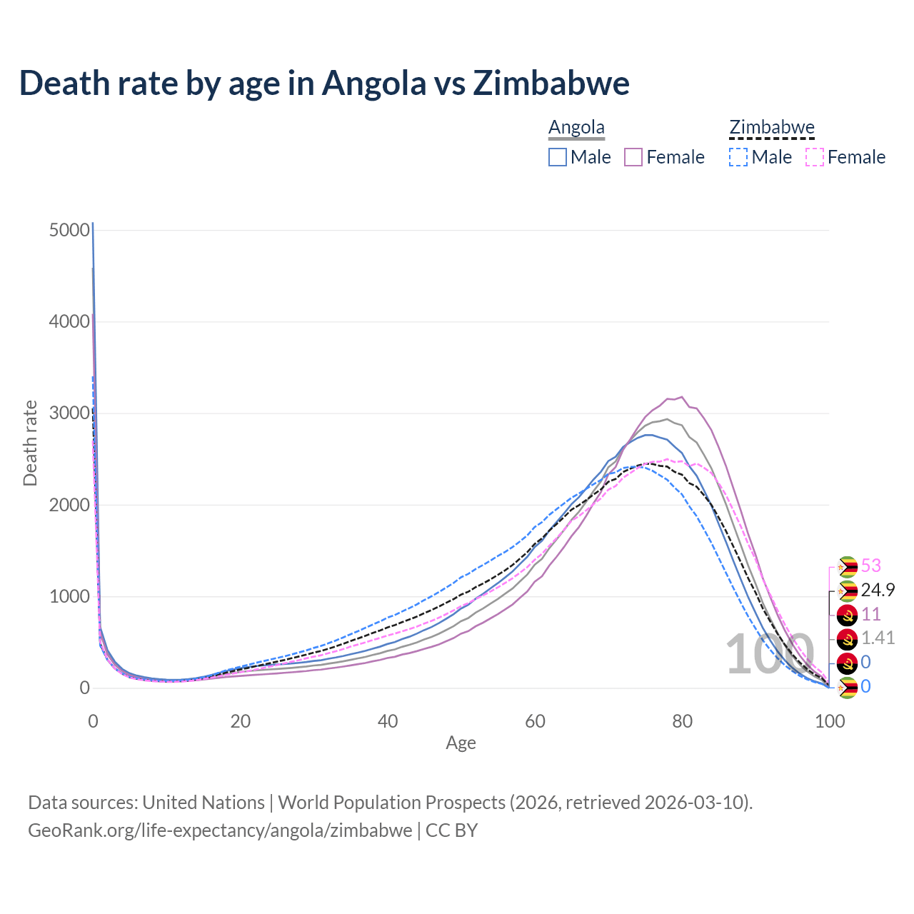 In Angola, the most common age of death is 0, compared to 0 in Zimbabwe. The median age of death is 71.9 in Angola and 68.8 in Zimbabwe, meaning only half of each cohort is expected to live past that age.