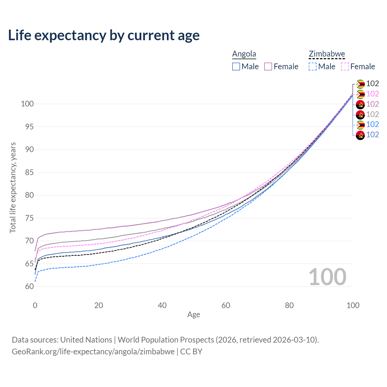 This life expectancy calculator shows the odds of living to 100, 95, 90, and below based on current age for both males and females in Angola and Zimbabwe, along with mean and median age of death. The calculations are based on the 2026 life tables (actuarial tables) from the UN World Population Prospects.