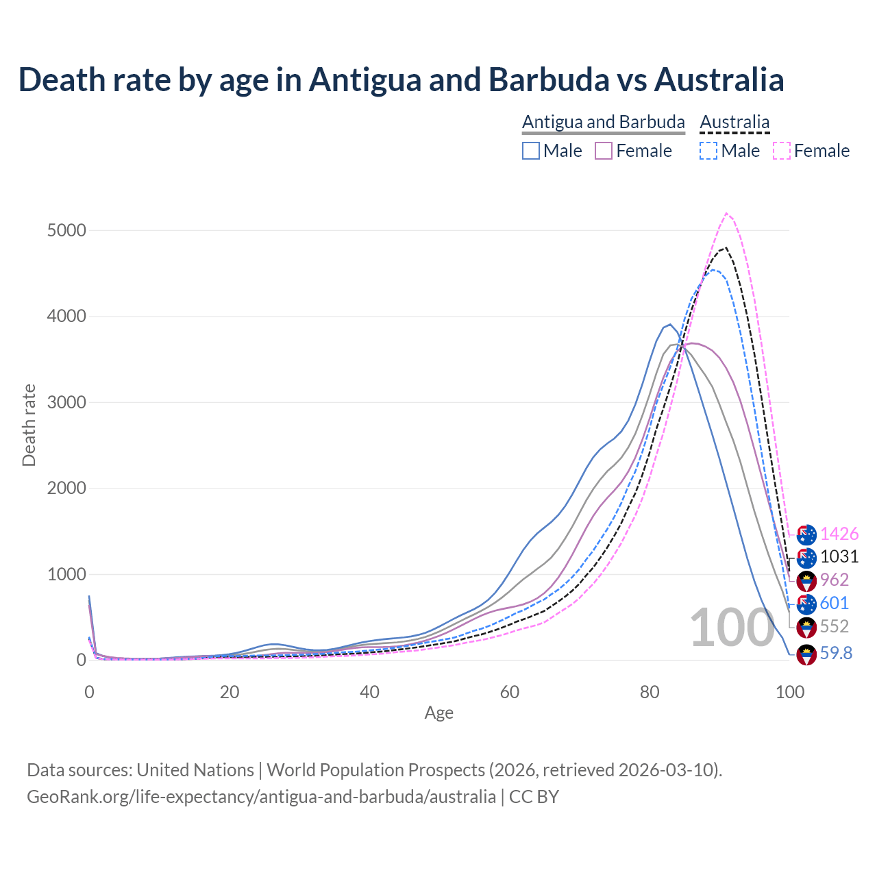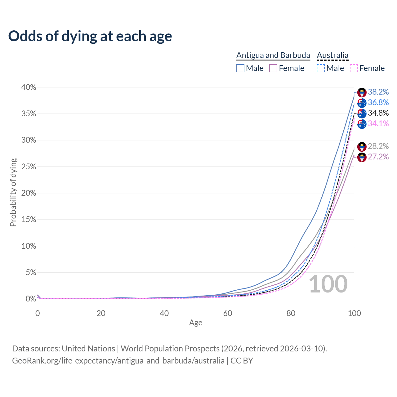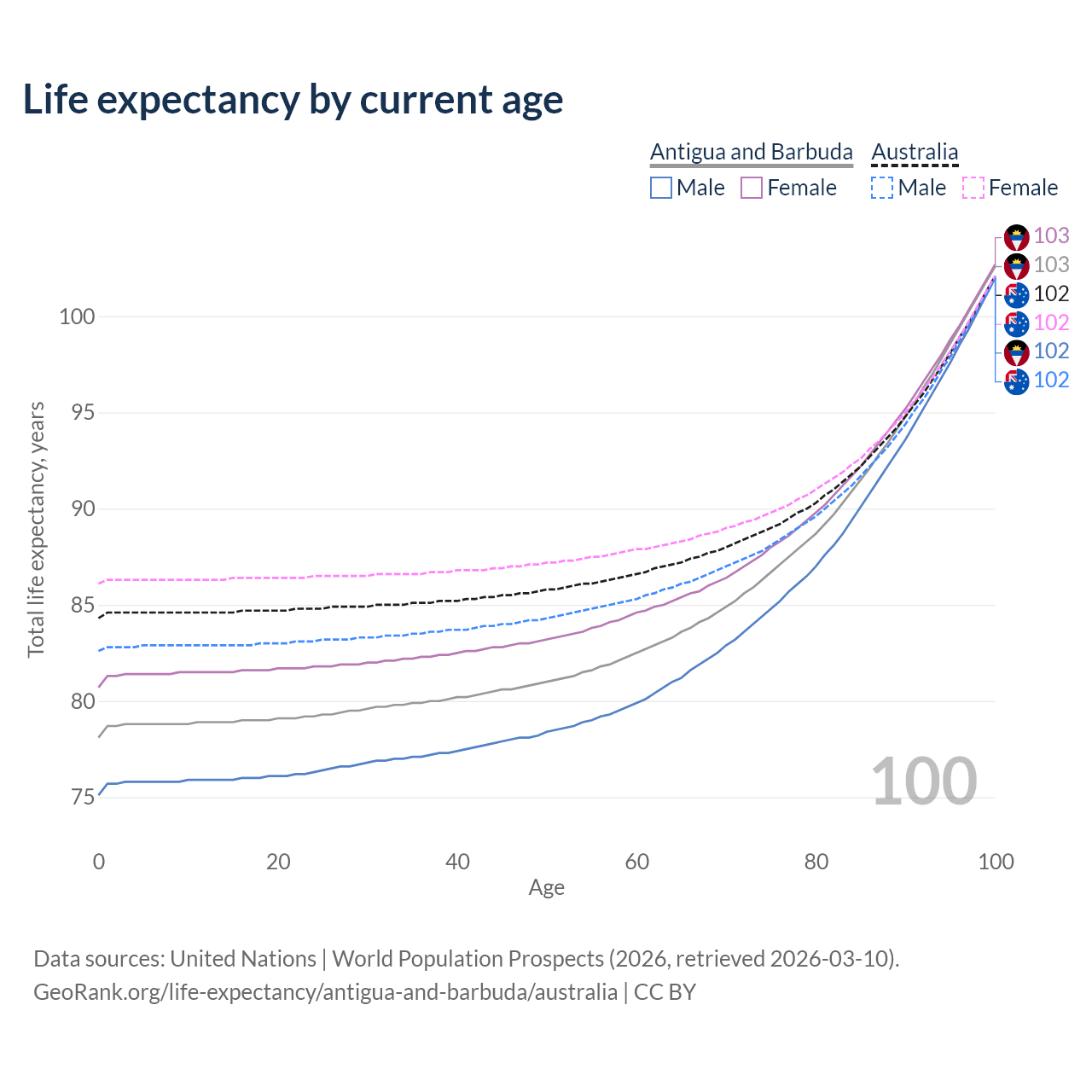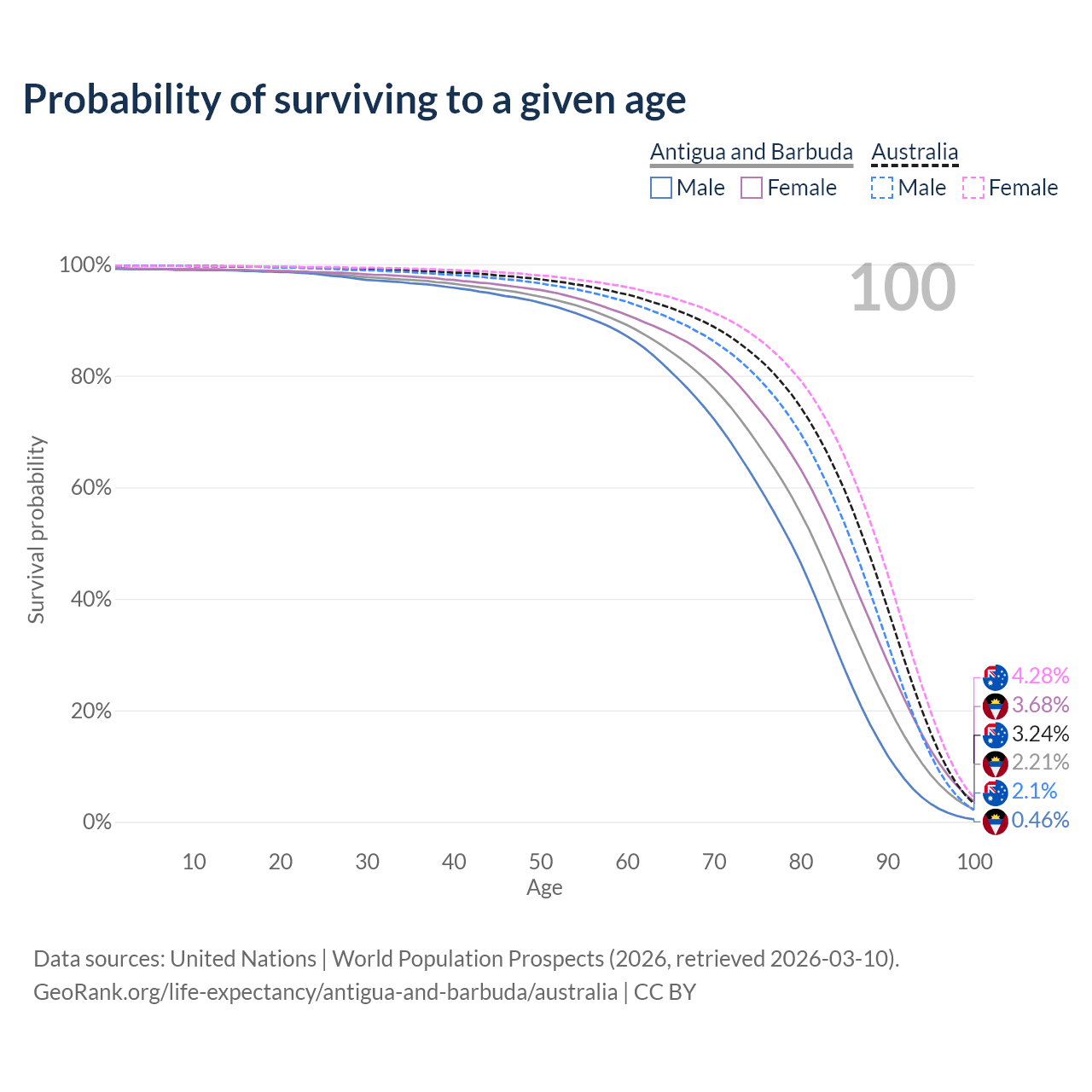 This life expectancy calculator shows the odds of living to 100, 95, 90, and below based on current age for both males and females in Antigua and Barbuda and Australia, along with mean and median age of death. The calculations are based on the 2026 life tables (actuarial tables) from the UN World Population Prospects.