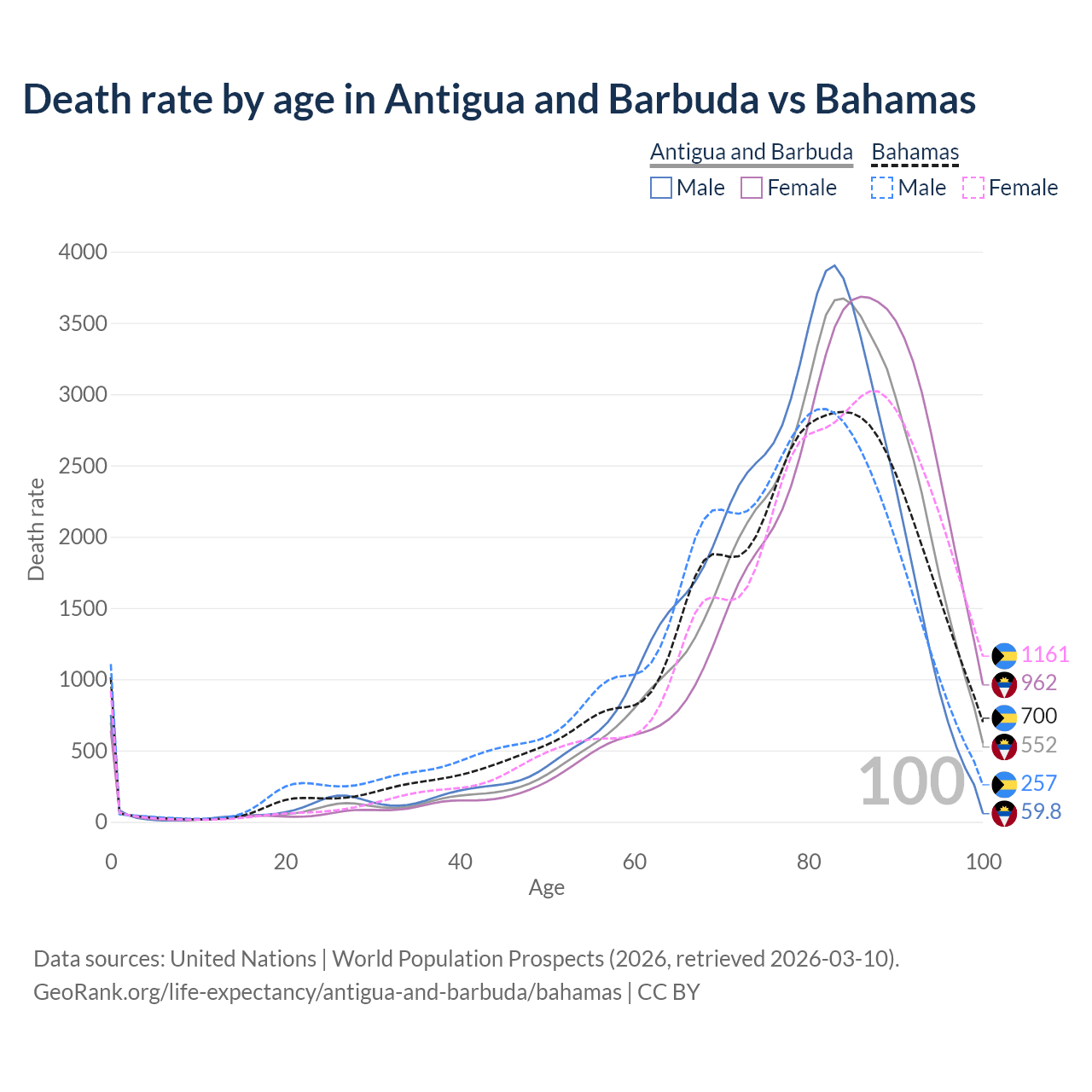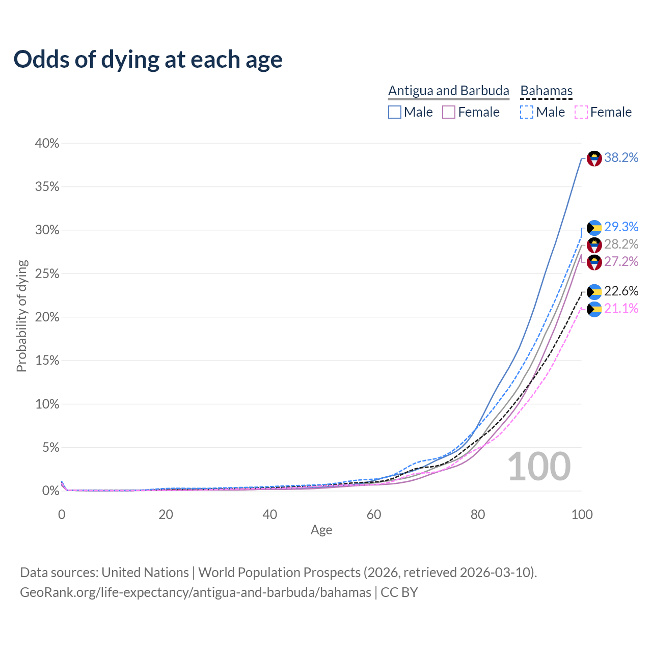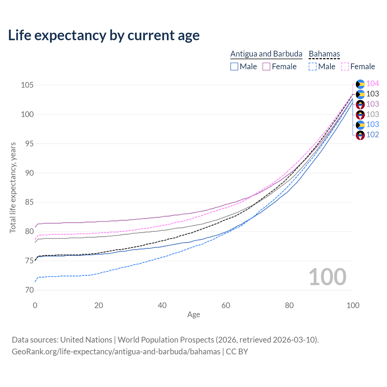 This life expectancy calculator shows the odds of living to 100, 95, 90, and below based on current age for both males and females in Antigua and Barbuda and the Bahamas, along with mean and median age of death. The calculations are based on the 2026 life tables (actuarial tables) from the UN World Population Prospects.