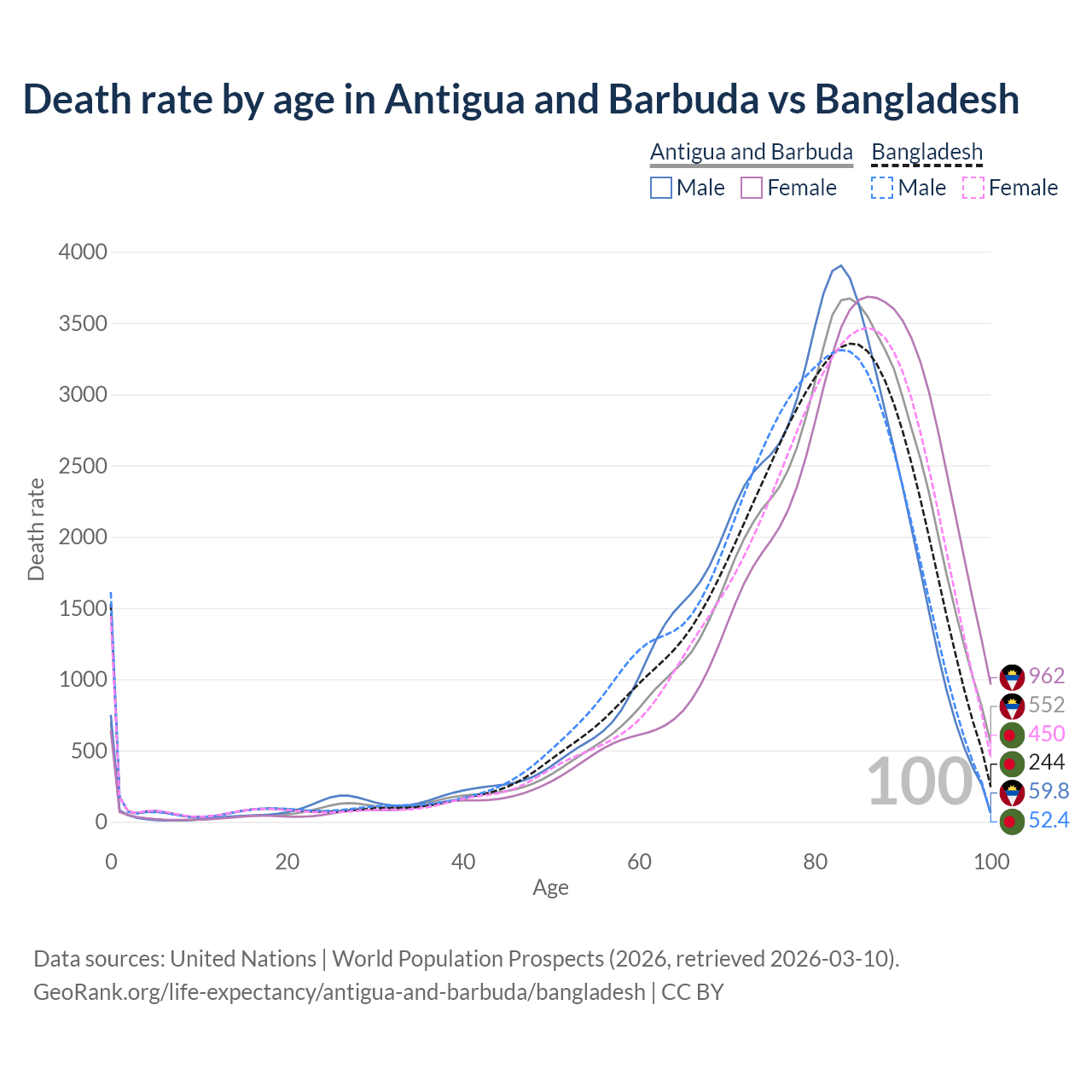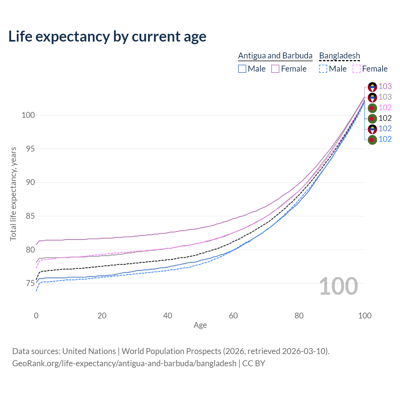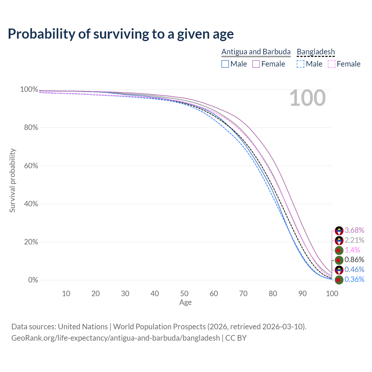 This life expectancy calculator shows the odds of living to 100, 95, 90, and below based on current age for both males and females in Antigua and Barbuda and Bangladesh, along with mean and median age of death. The calculations are based on the 2026 life tables (actuarial tables) from the UN World Population Prospects.