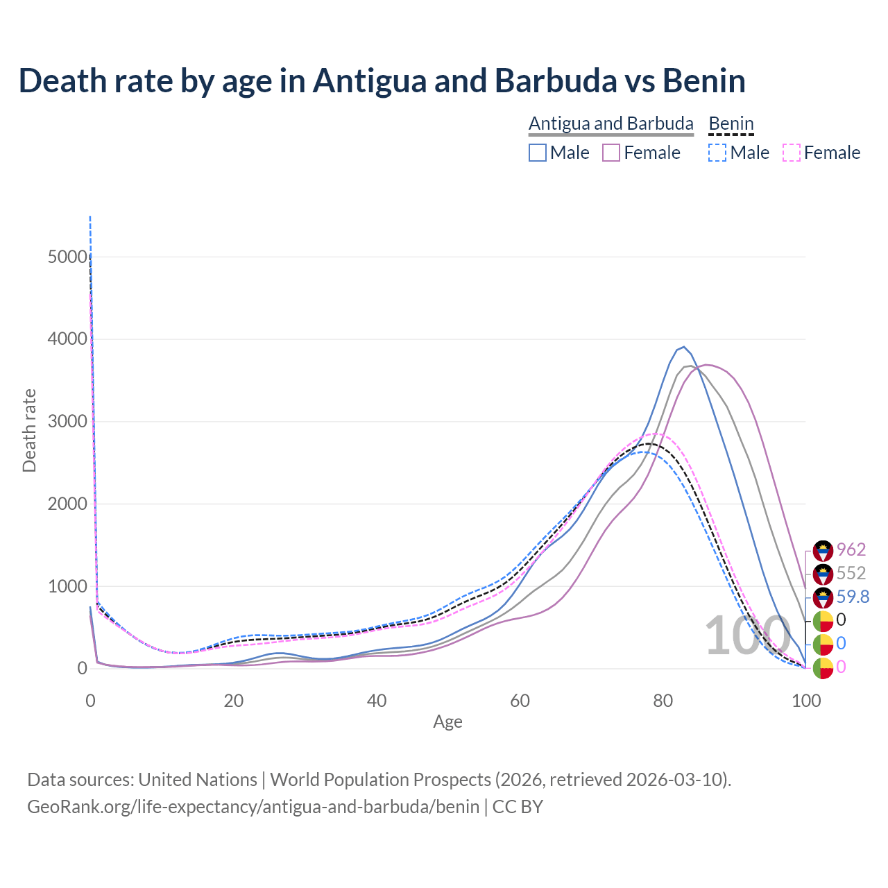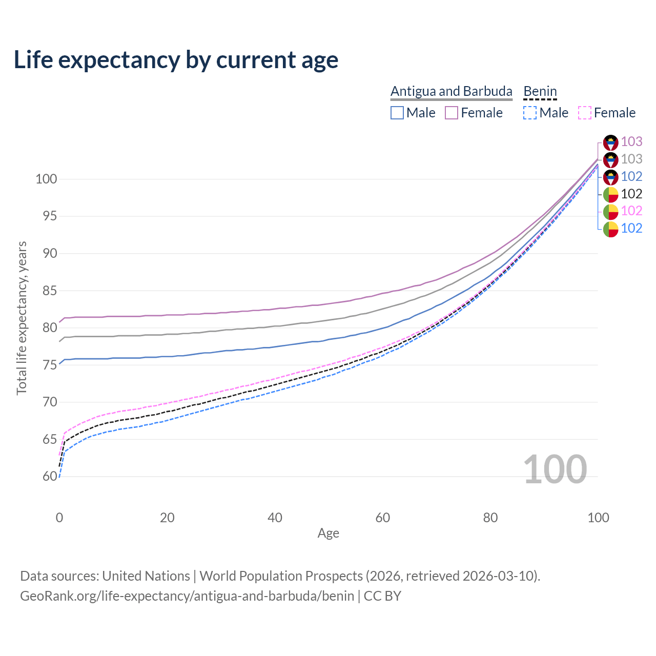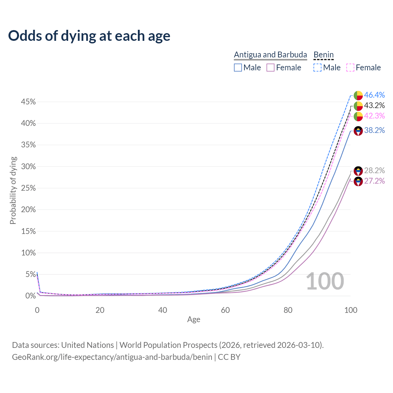 This life expectancy calculator shows the odds of living to 100, 95, 90, and below based on current age for both males and females in Antigua and Barbuda and Benin, along with mean and median age of death. The calculations are based on the 2026 life tables (actuarial tables) from the UN World Population Prospects.